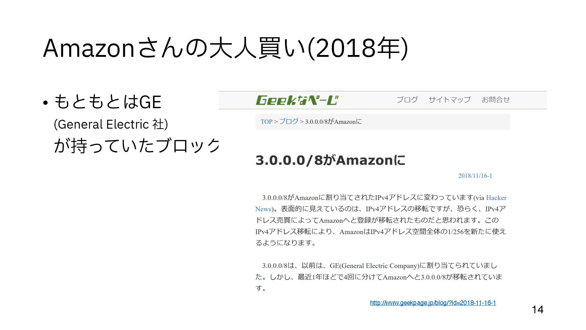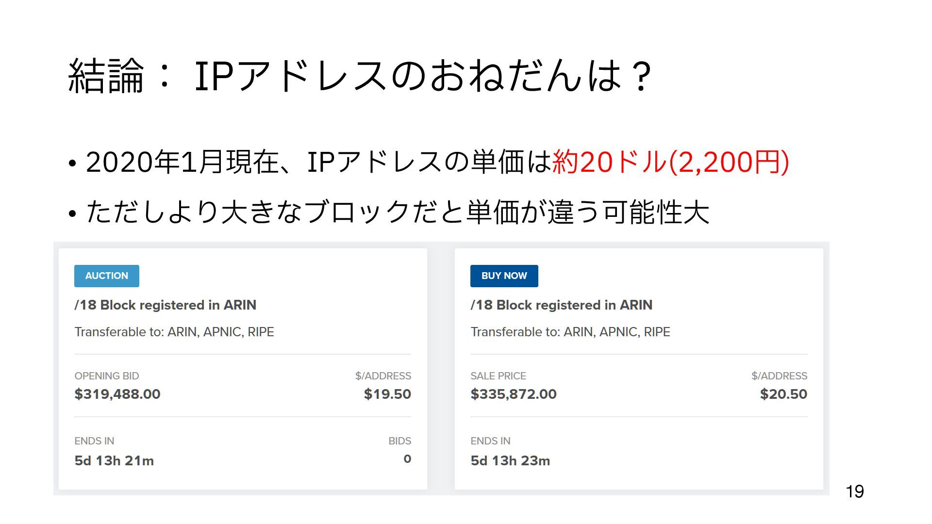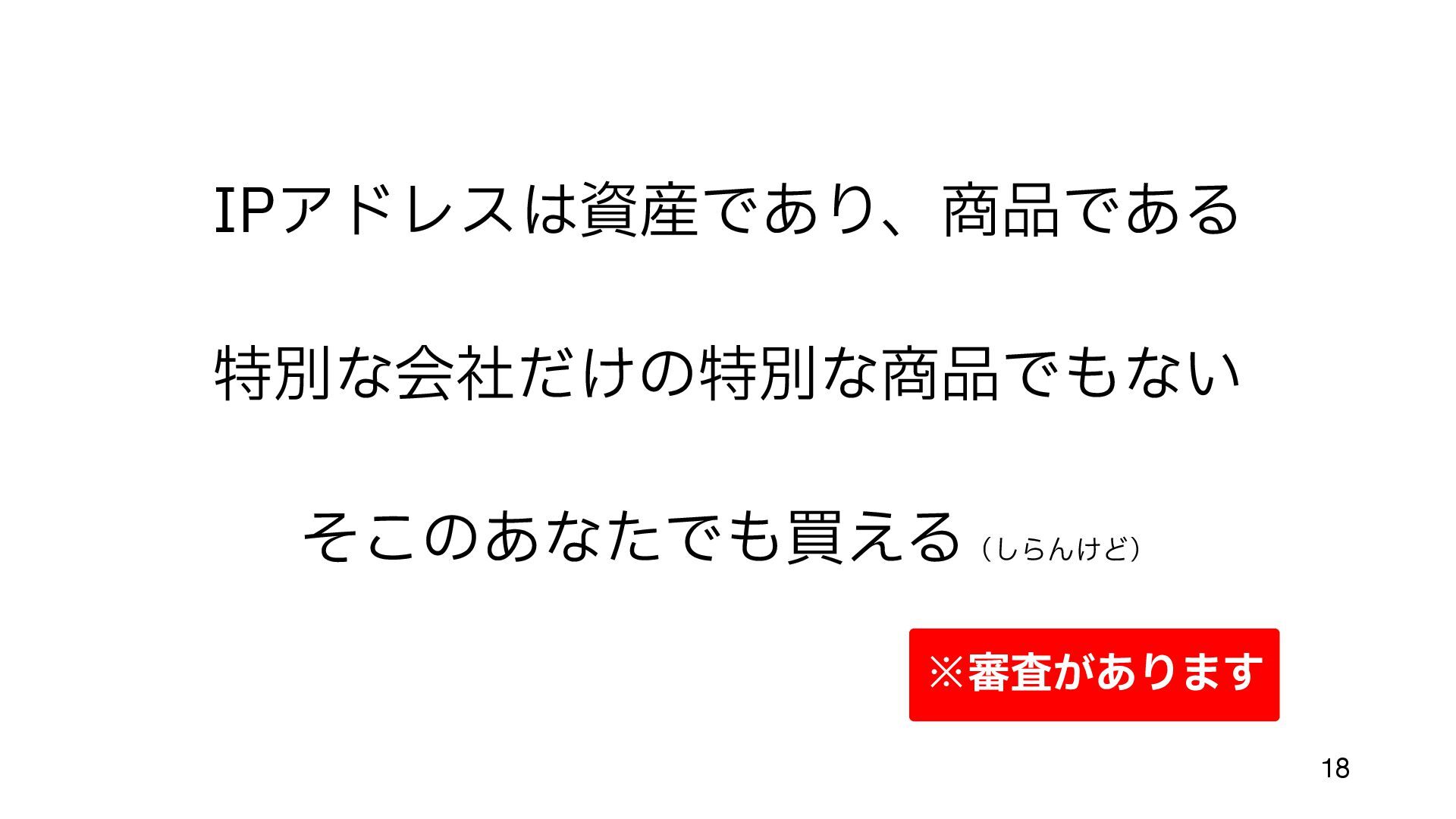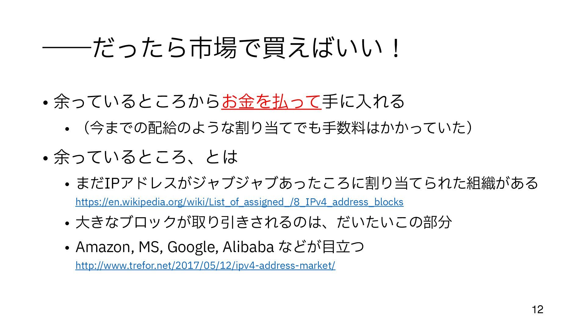(今までの配給のような割り当てでも 手 数料はかかっていた) • 余っているところ、とは • まだIPアドレスがジャブジャブあったころに割り当てられた組織がある https://en.wikipedia.org/wiki/List_of_assigned_/8_IPv4_address_blocks • 大 きなブロックが取り引きされるのは、だいたいこの部分 • Amazon, MS, Google, Alibaba などが 目 立 つ http://www.trefor.net/2017/05/12/ipv4-address-market/ 12
