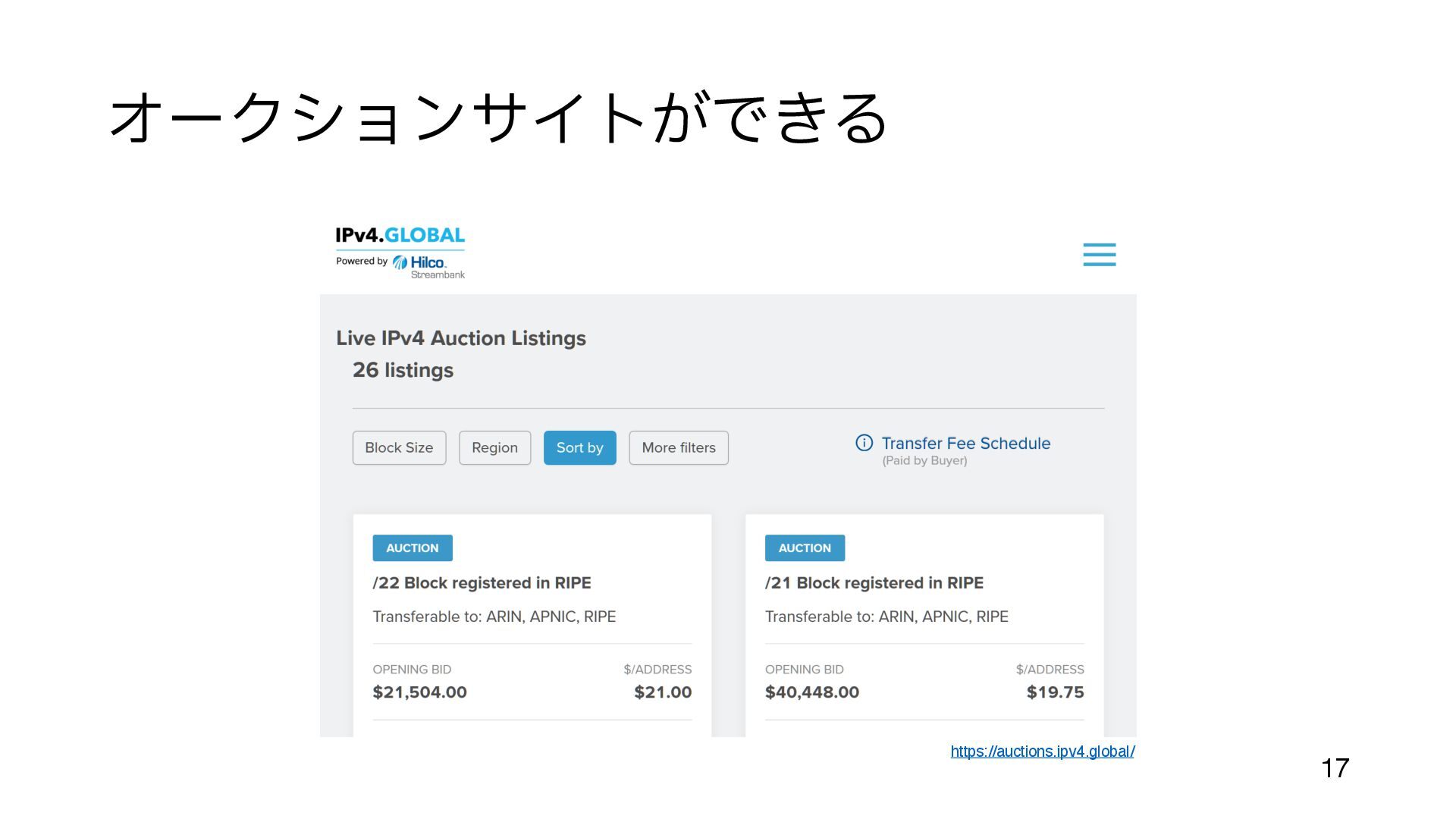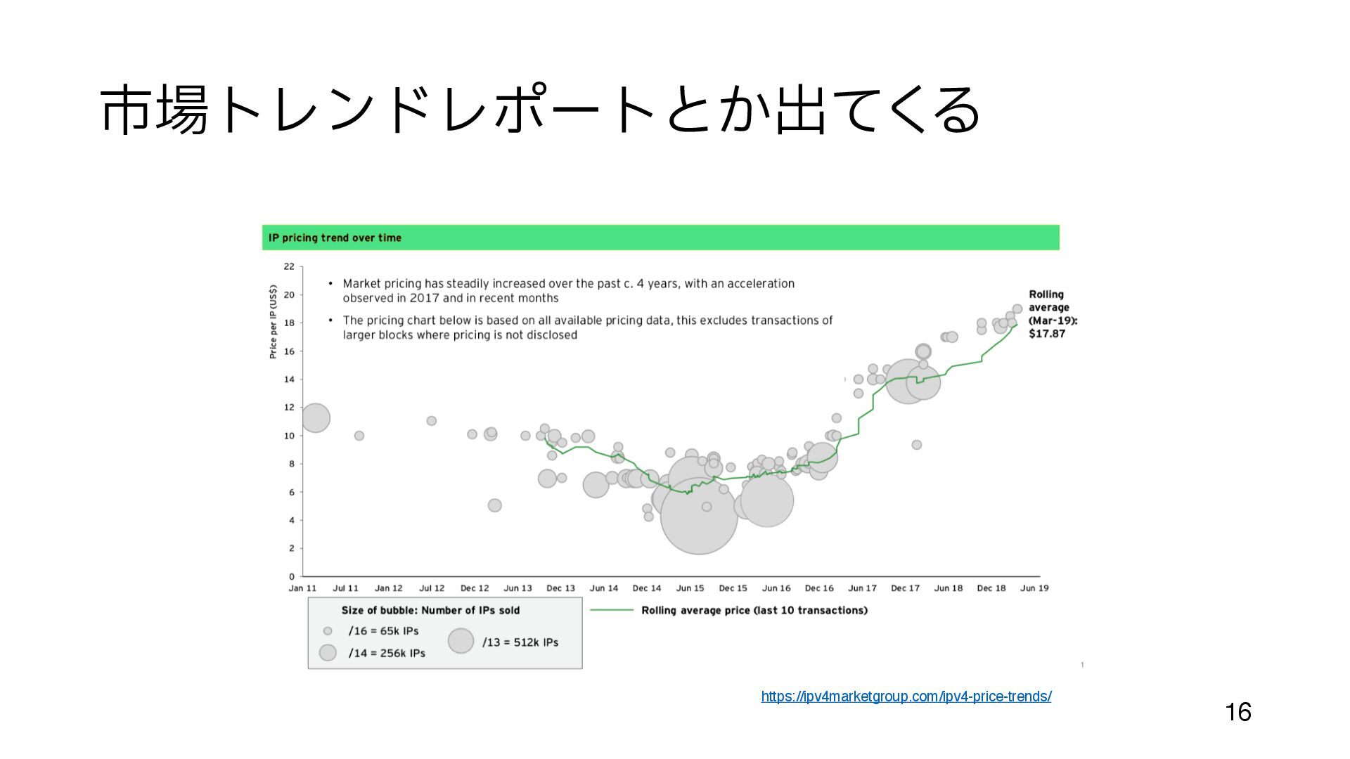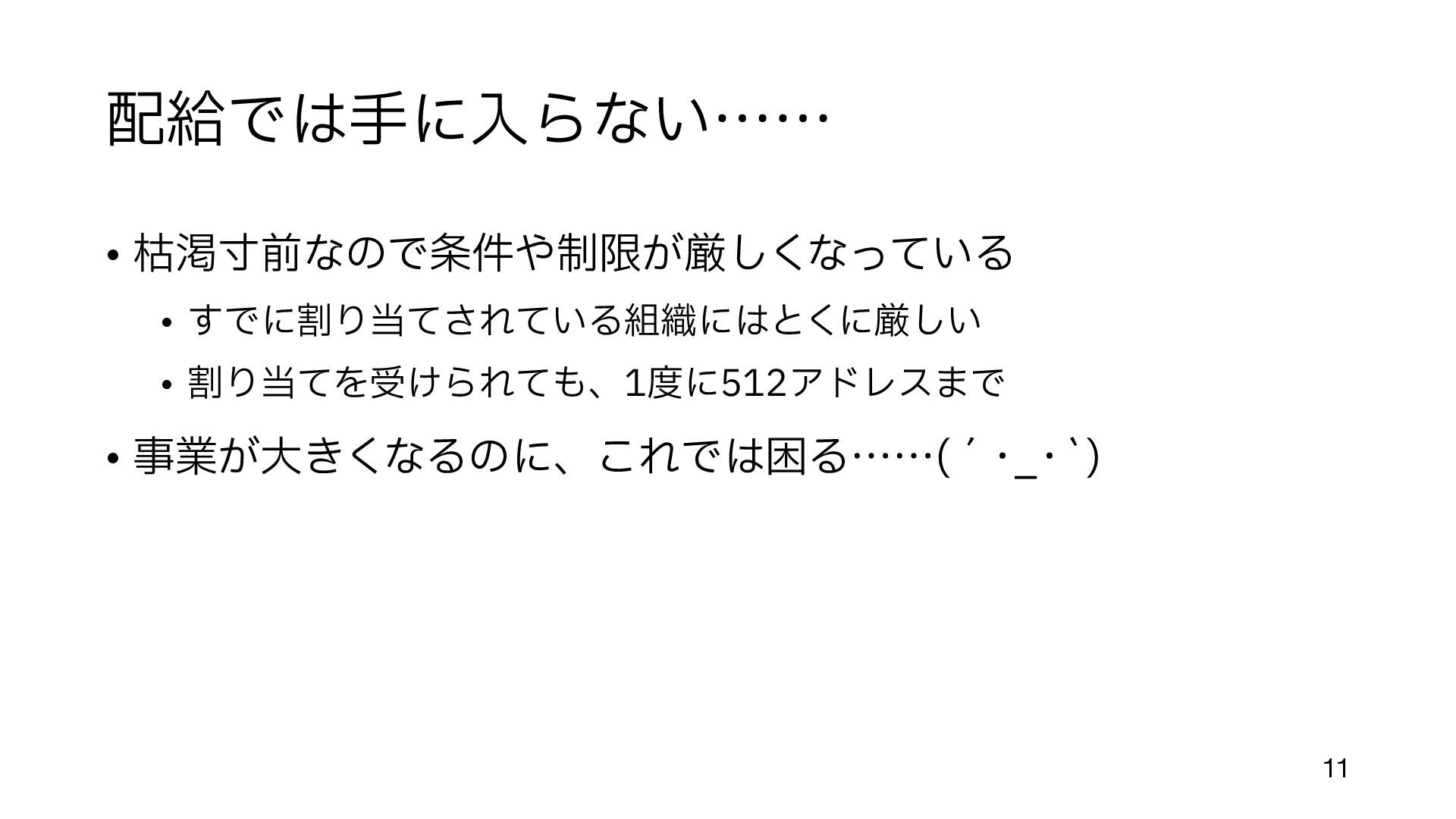 (今までの配給のような割り当てでも 手 数料はかかっていた) • 余っているところ、とは • まだIPアドレスがジャブジャブあったころに割り当てられた組織がある https://en.wikipedia.org/wiki/List_of_assigned_/8_IPv4_address_blocks • 大 きなブロックが取り引きされるのは、だいたいこの部分 • Amazon, MS, Google, Alibaba などが 目 立 つ http://www.trefor.net/2017/05/12/ipv4-address-market/ 12