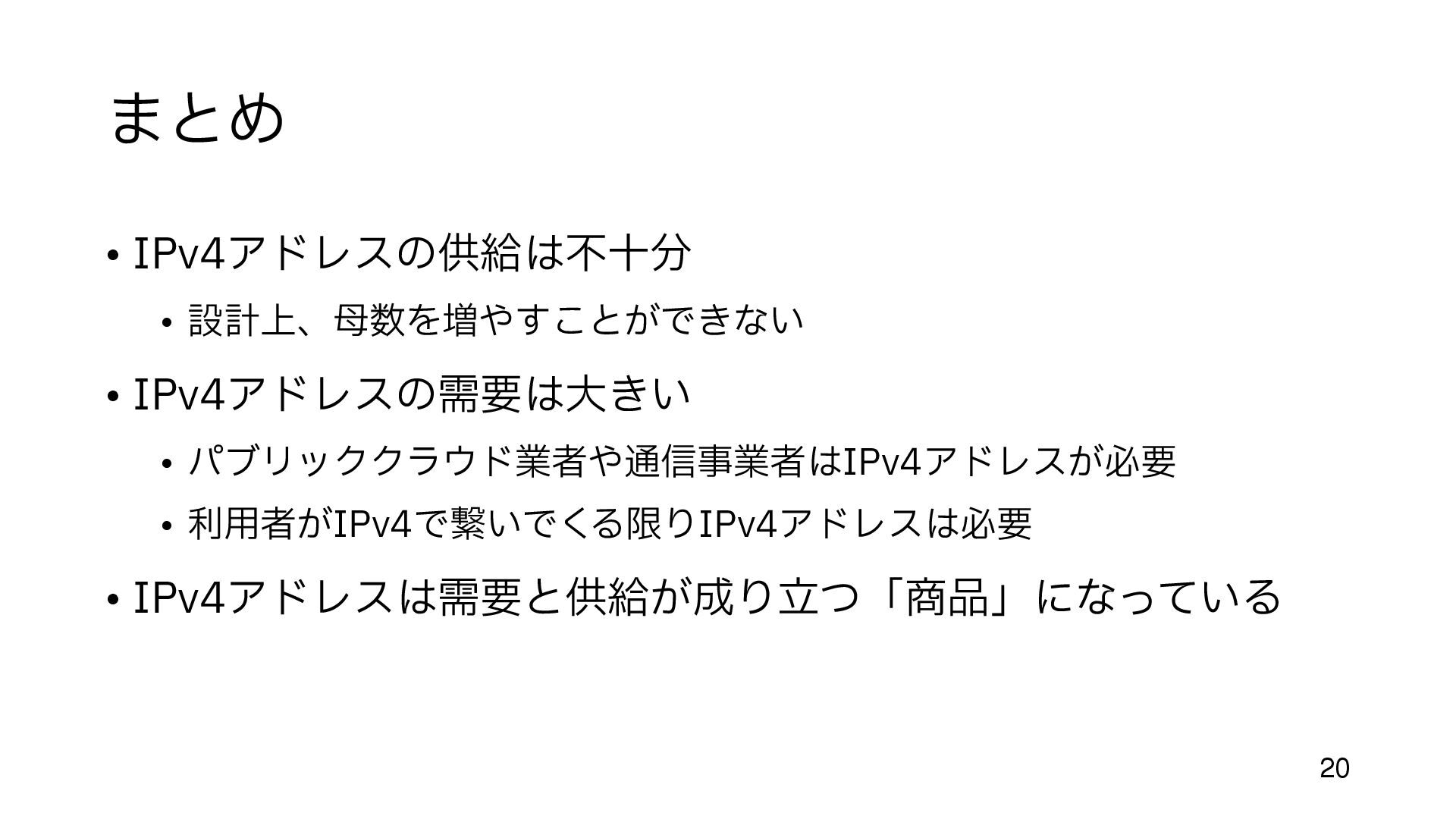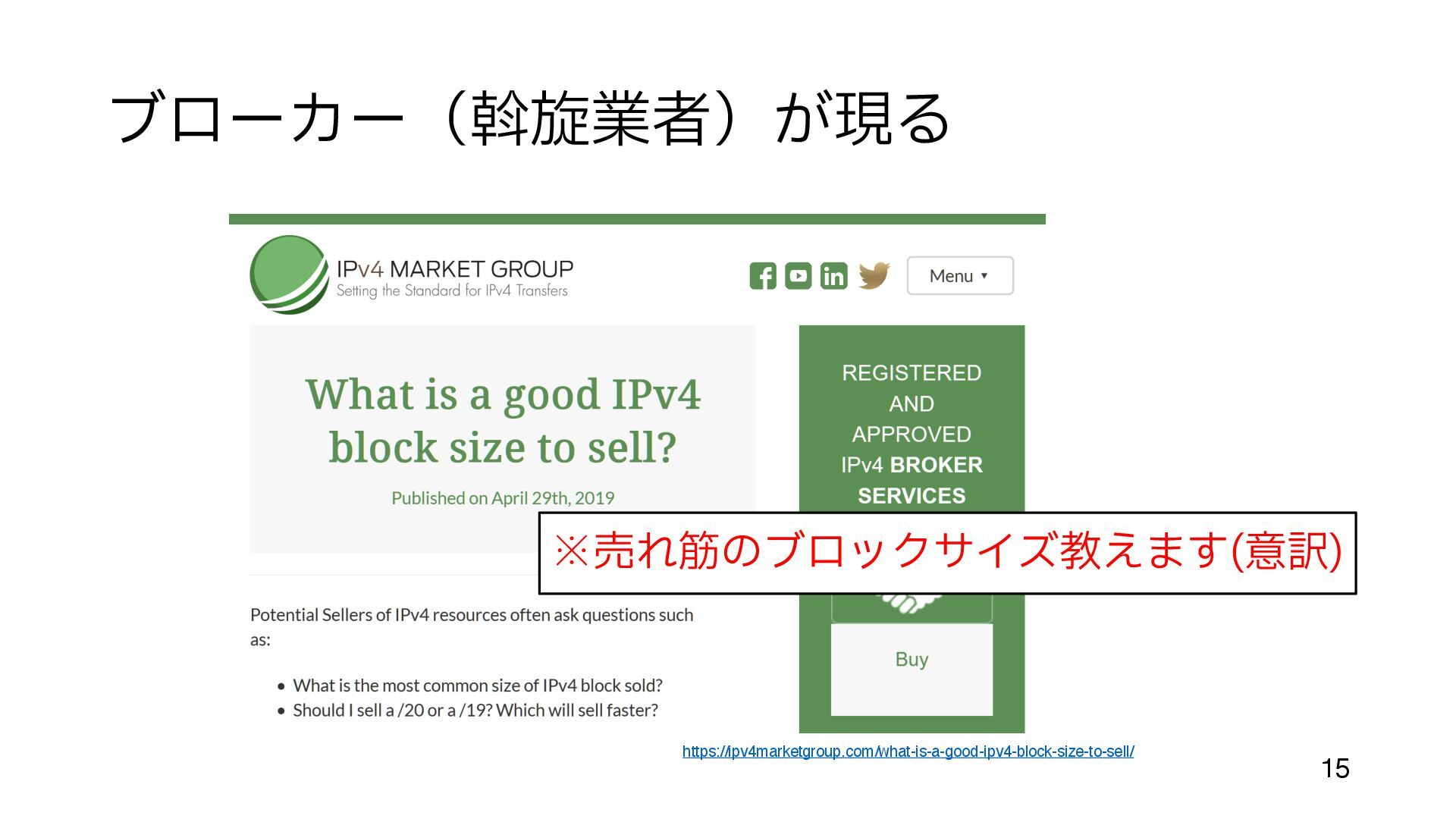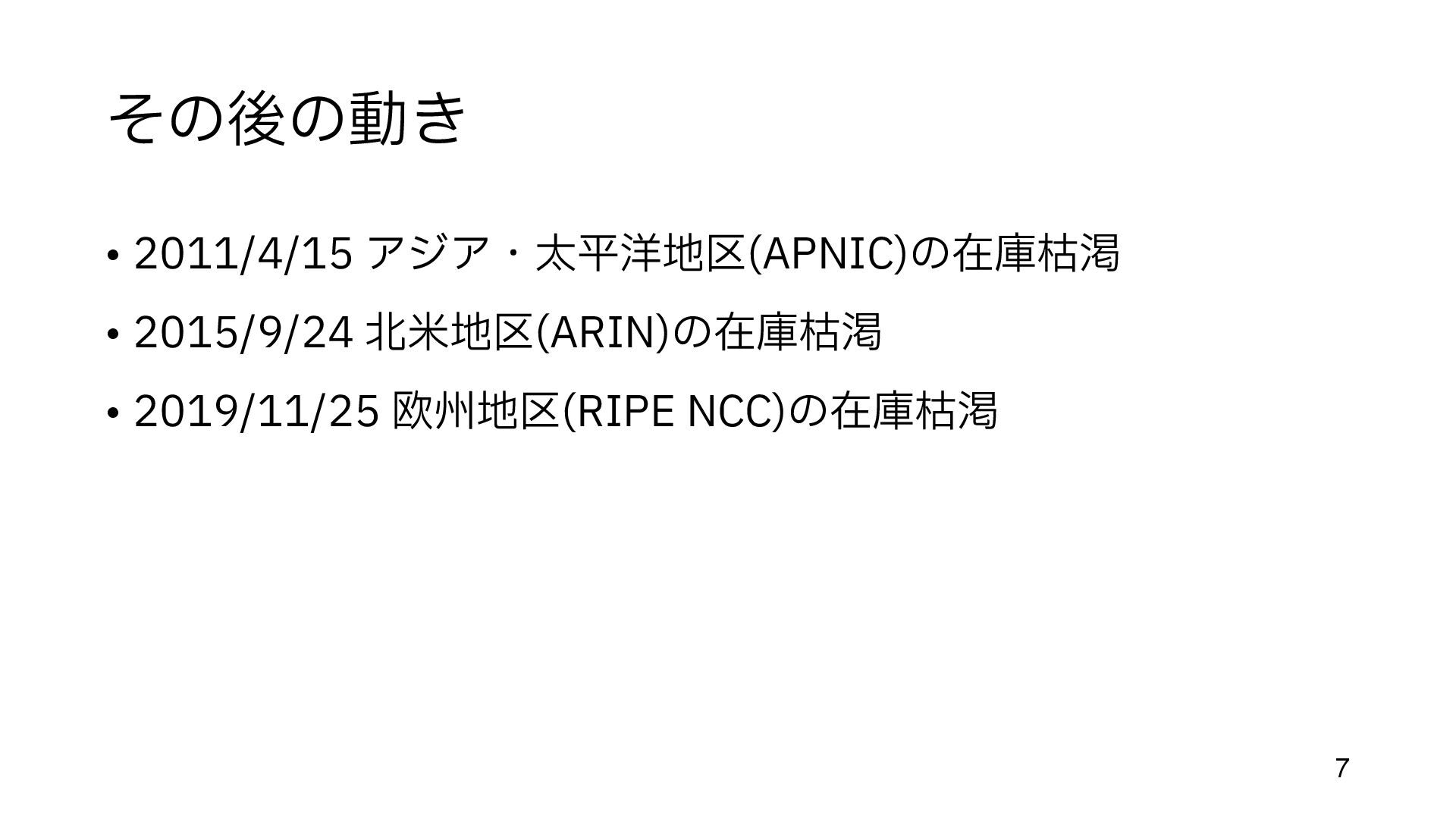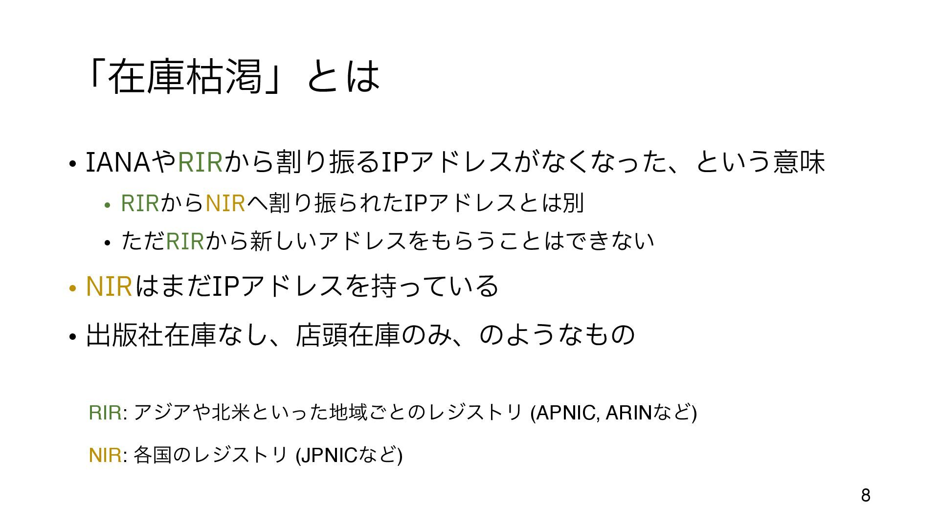 (今までの配給のような割り当てでも 手 数料はかかっていた) • 余っているところ、とは • まだIPアドレスがジャブジャブあったころに割り当てられた組織がある https://en.wikipedia.org/wiki/List_of_assigned_/8_IPv4_address_blocks • 大 きなブロックが取り引きされるのは、だいたいこの部分 • Amazon, MS, Google, Alibaba などが 目 立 つ http://www.trefor.net/2017/05/12/ipv4-address-market/ 12