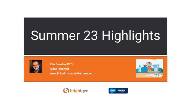 Slide deck from BrightGen's webinar on the Summer '23 release of Salesforce. Covering new and retiring features, plus a few interesting betas and presented by Keir Bowden, CTO. You can find the recording at : https://youtu.be/ThiCyrKIWMU