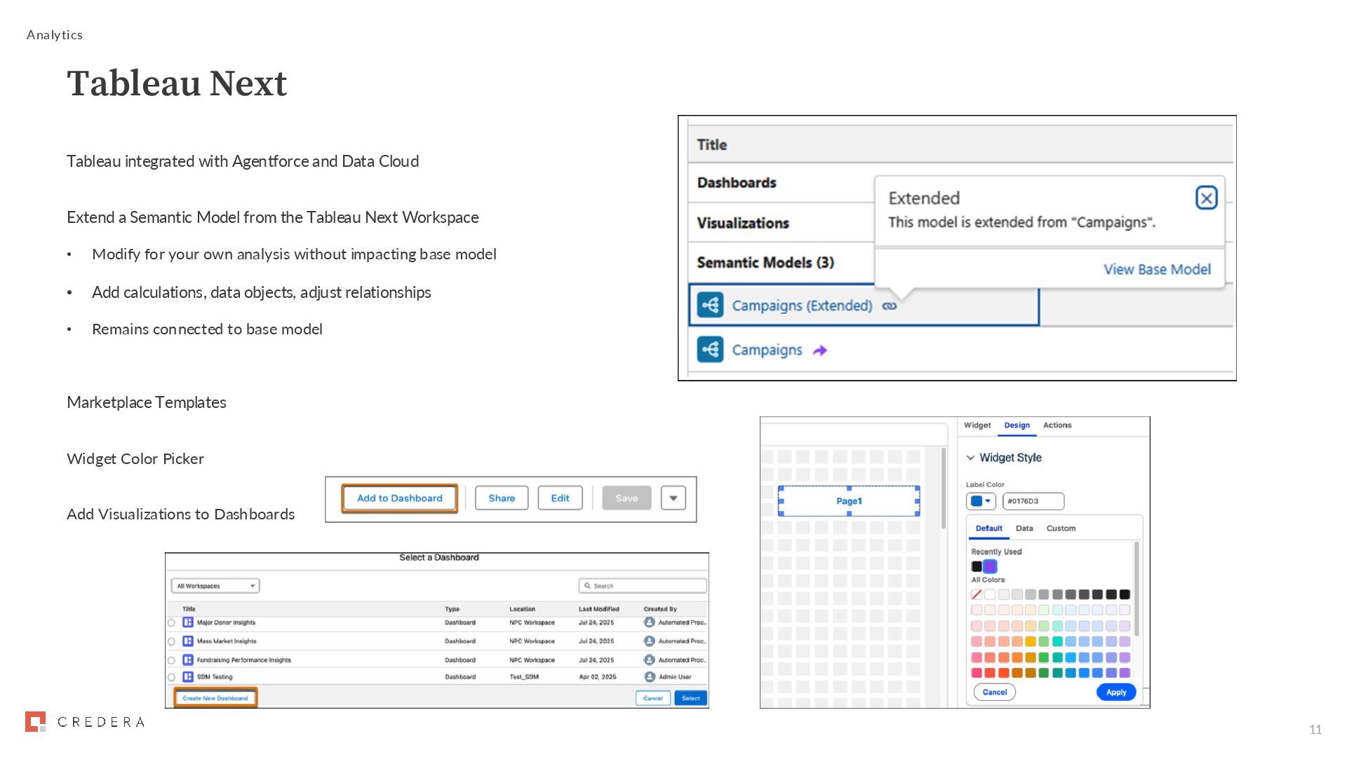 Semantic Model from the Tableau Next Workspace • Modify for your own analysis without impacting base model • Add calculations, data objects, adjust relationships • Remains connected to base model Marketplace Templates Widget Color Picker Add Visualizations to Dashboards Analytics Tableau Next