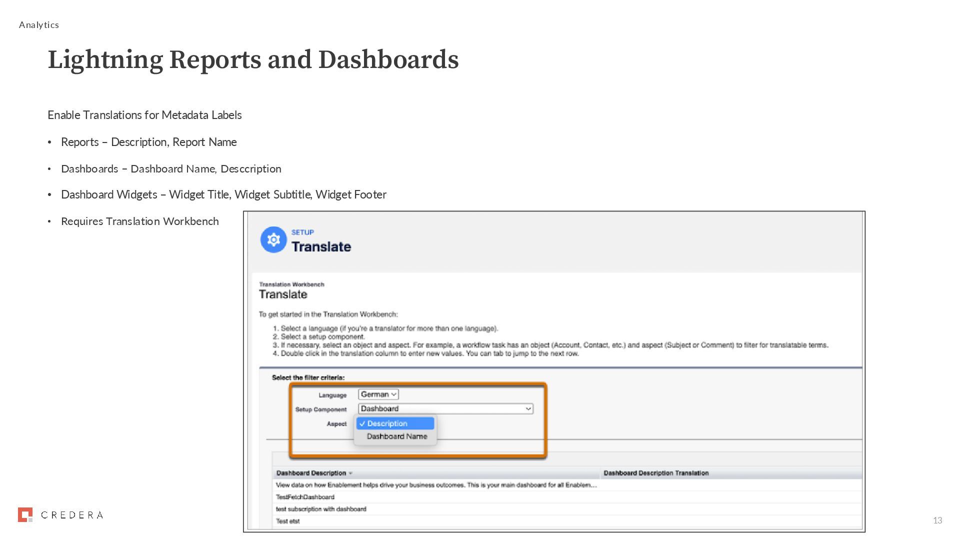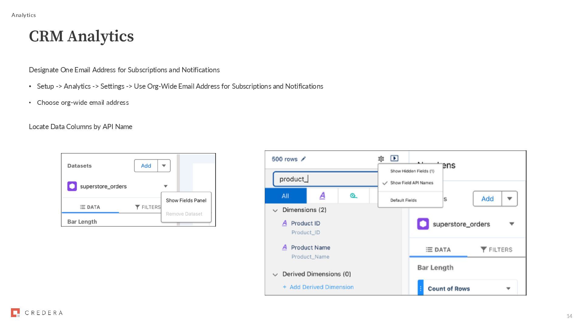 Setup -> Analytics -> Settings -> Use Org-Wide Email Address for Subscriptions and Notifications • Choose org-wide email address Locate Data Columns by API Name Analytics CRM Analytics