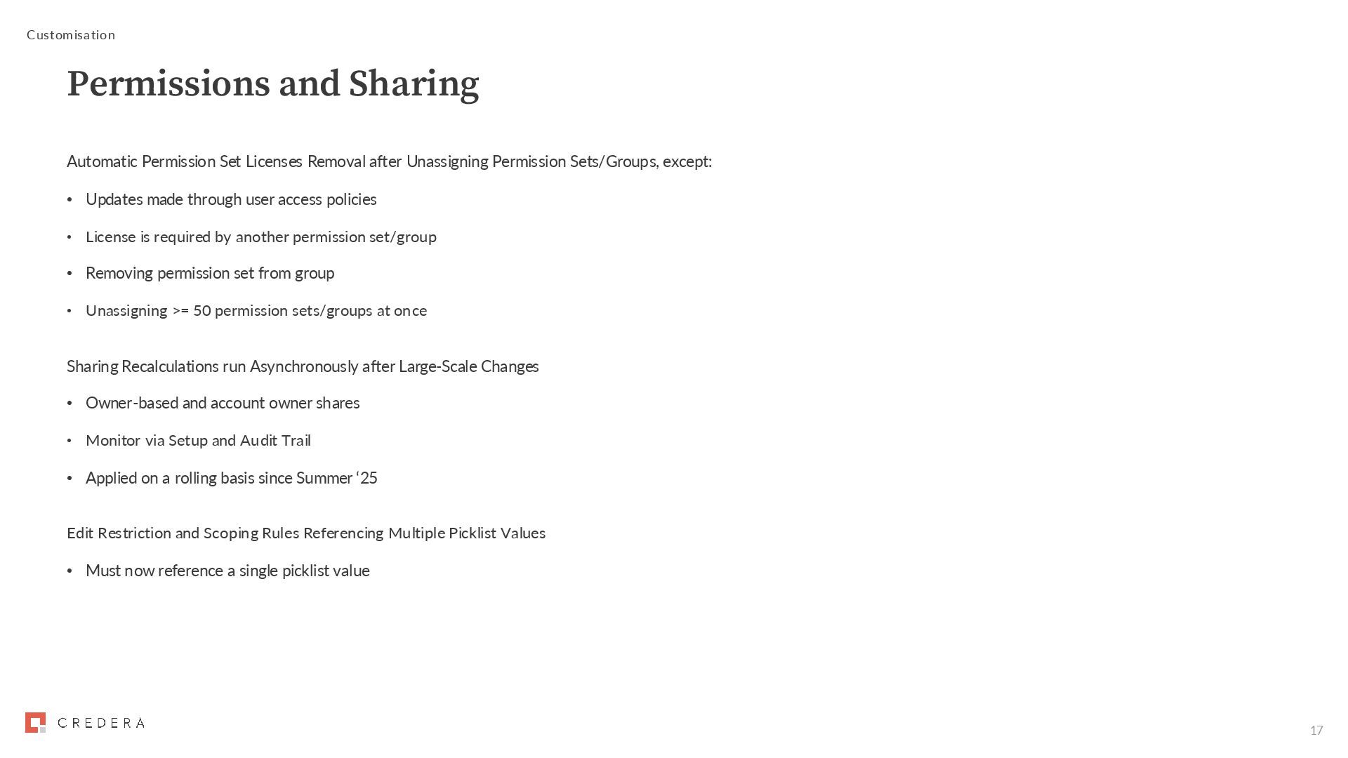 after Unassigning Permission Sets/Groups, except: • Updates made through user access policies • License is required by another permission set/group • Removing permission set from group • Unassigning >= 50 permission sets/groups at once Sharing Recalculations run Asynchronously after Large-Scale Changes • Owner-based and account owner shares • Monitor via Setup and Audit Trail • Applied on a rolling basis since Summer ‘25 Edit Restriction and Scoping Rules Referencing Multiple Picklist Values • Must now reference a single picklist value