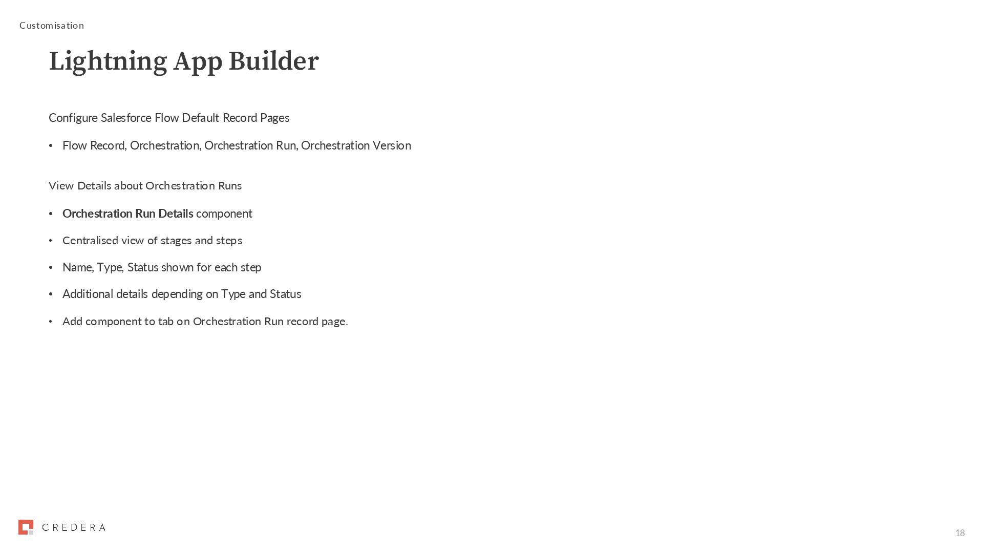 Pages • Flow Record, Orchestration, Orchestration Run, Orchestration Version View Details about Orchestration Runs • Orchestration Run Details component • Centralised view of stages and steps • Name, Type, Status shown for each step • Additional details depending on Type and Status • Add component to tab on Orchestration Run record page.