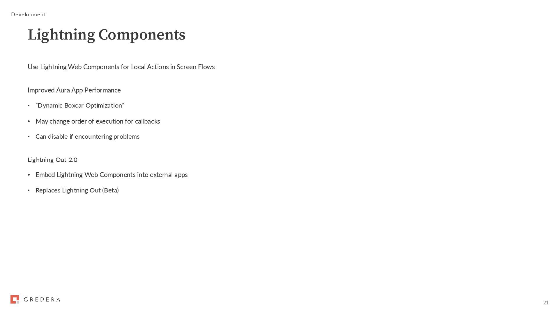 Flows Improved Aura App Performance • ”Dynamic Boxcar Optimization” • May change order of execution for callbacks • Can disable if encountering problems Lightning Out 2.0 • Embed Lightning Web Components into external apps • Replaces Lightning Out (Beta) Development Lightning Components