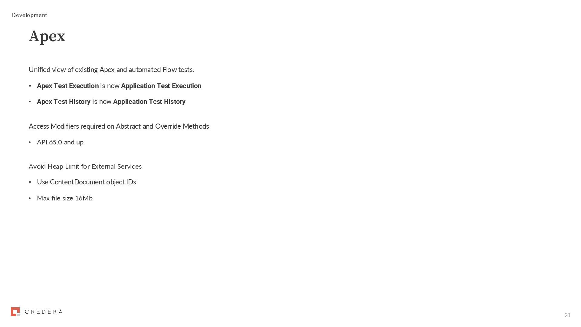 • Apex Test Execution is now Application Test Execution • Apex Test History is now Application Test History Access Modifiers required on Abstract and Override Methods • API 65.0 and up Avoid Heap Limit for External Services • Use ContentDocument object IDs • Max file size 16Mb Development Apex