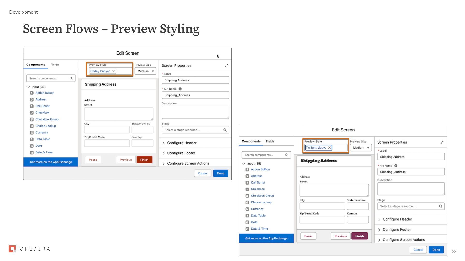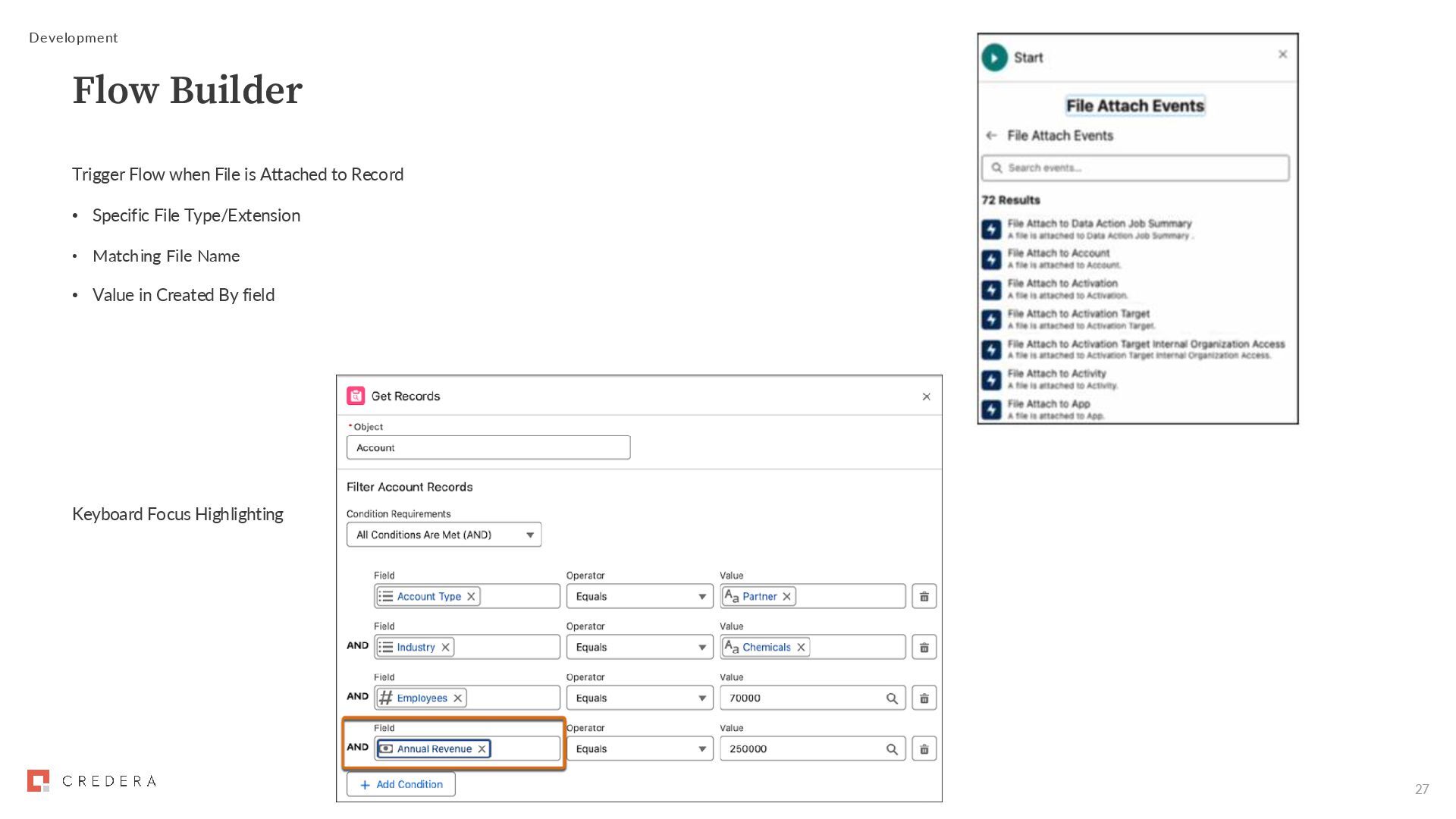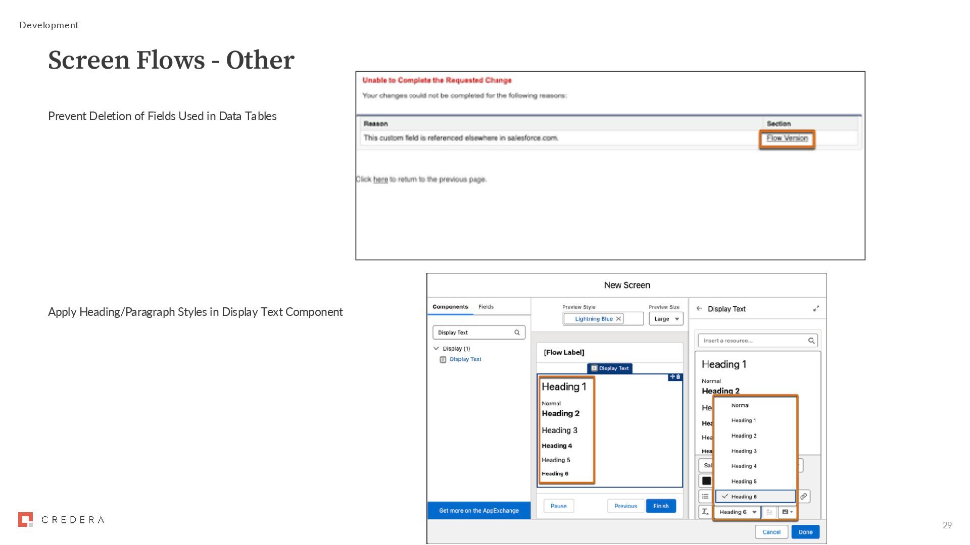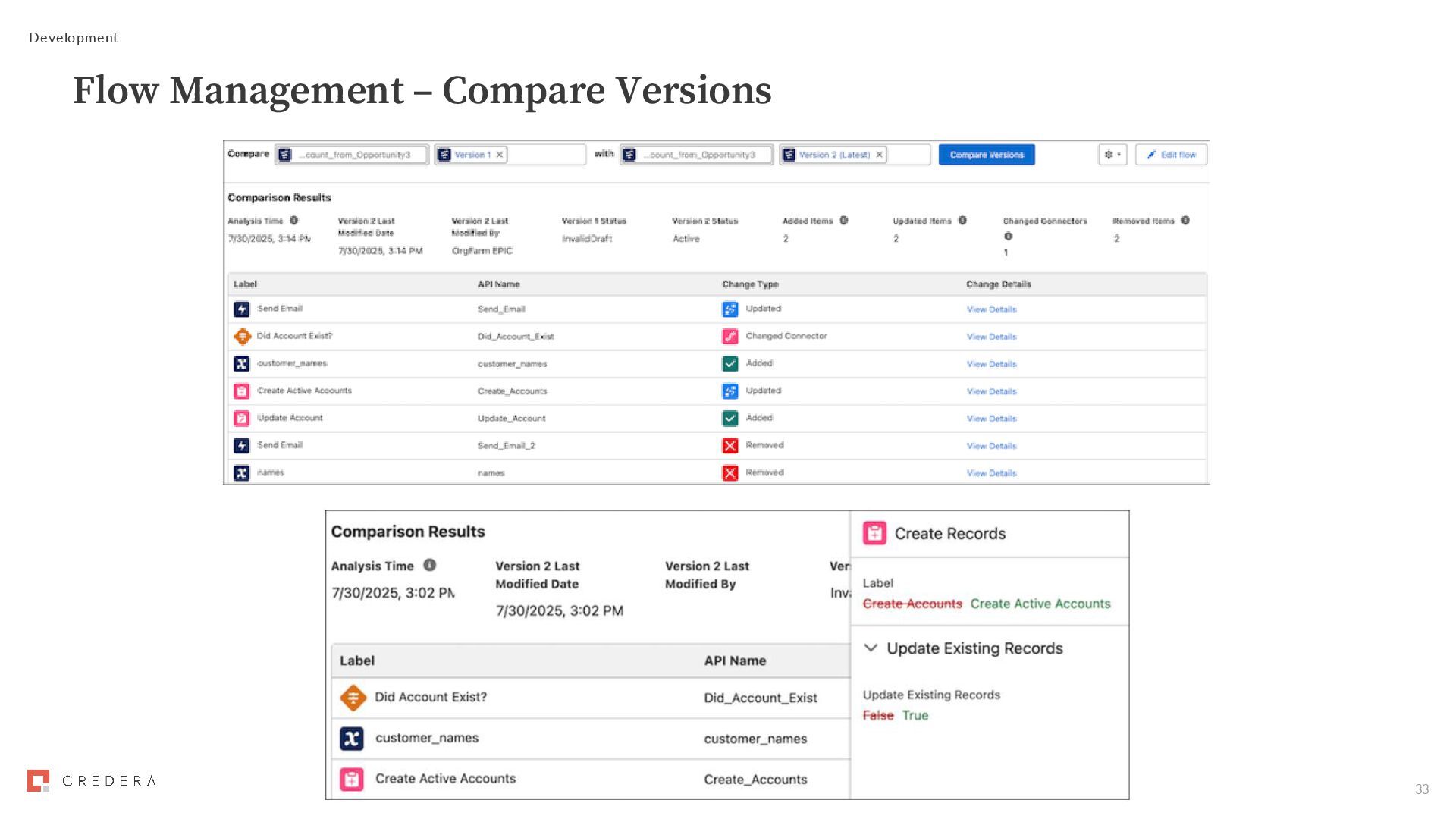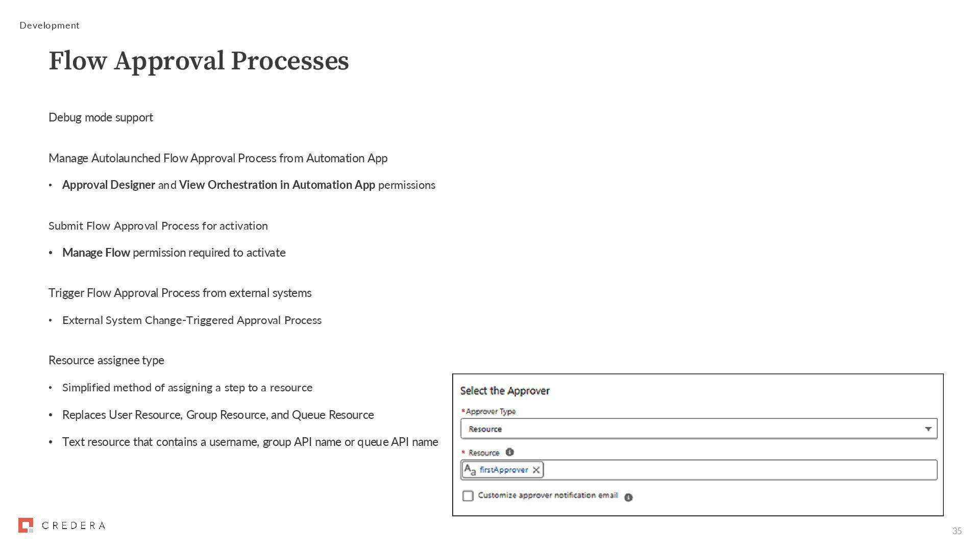 Automation App • Approval Designer and View Orchestration in Automation App permissions Submit Flow Approval Process for activation • Manage Flow permission required to activate Trigger Flow Approval Process from external systems • External System Change-Triggered Approval Process Resource assignee type • Simplified method of assigning a step to a resource • Replaces User Resource, Group Resource, and Queue Resource • Text resource that contains a username, group API name or queue API name Development Flow Approval Processes