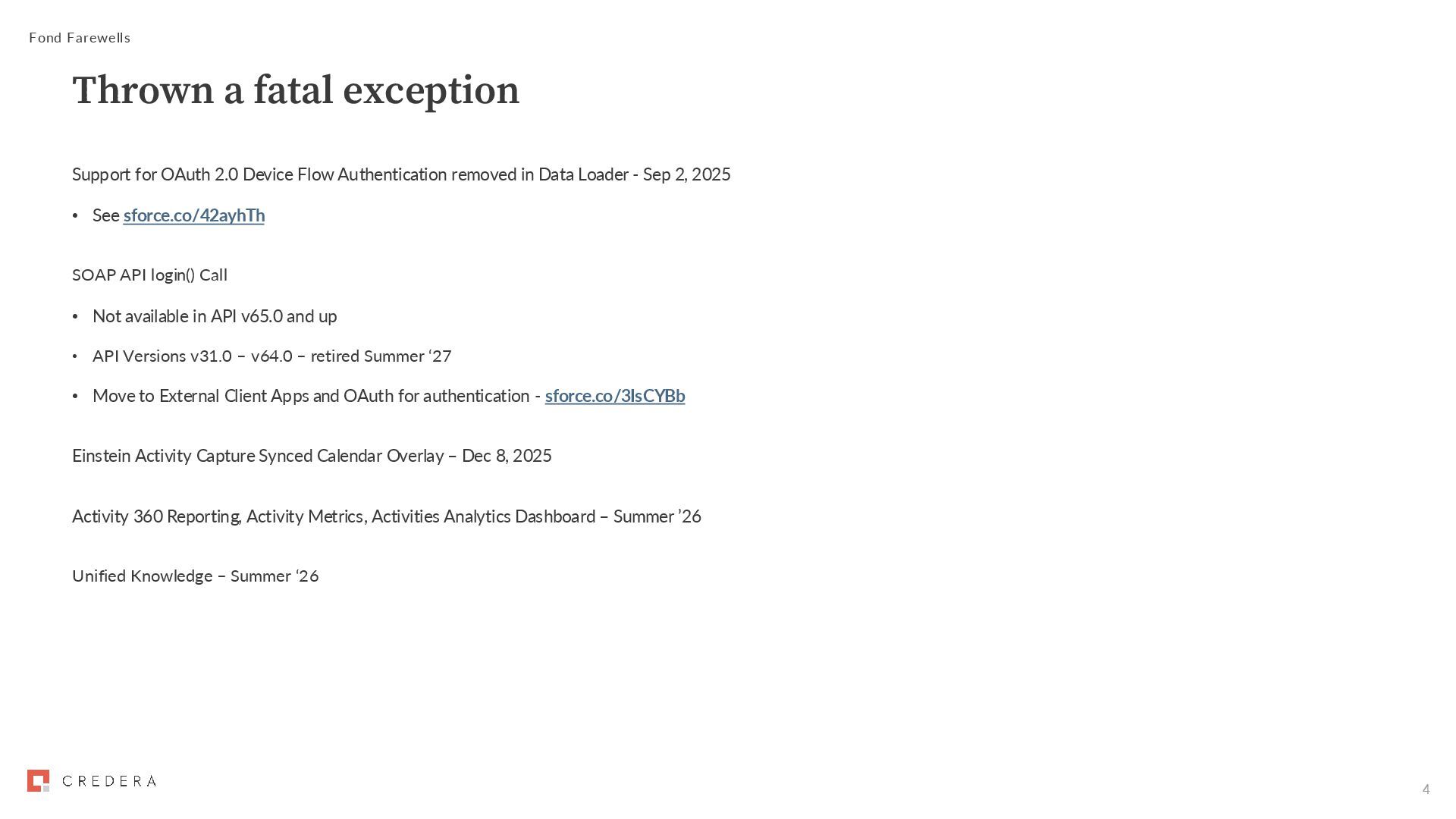 Data Loader - Sep 2, 2025 • See sforce.co/42ayhTh SOAP API login() Call • Not available in API v65.0 and up • API Versions v31.0 – v64.0 – retired Summer ‘27 • Move to External Client Apps and OAuth for authentication - sforce.co/3IsCYBb Einstein Activity Capture Synced Calendar Overlay – Dec 8, 2025 Activity 360 Reporting, Activity Metrics, Activities Analytics Dashboard – Summer ’26 Unified Knowledge – Summer ‘26 Fond Farewells Thrown a fatal exception
