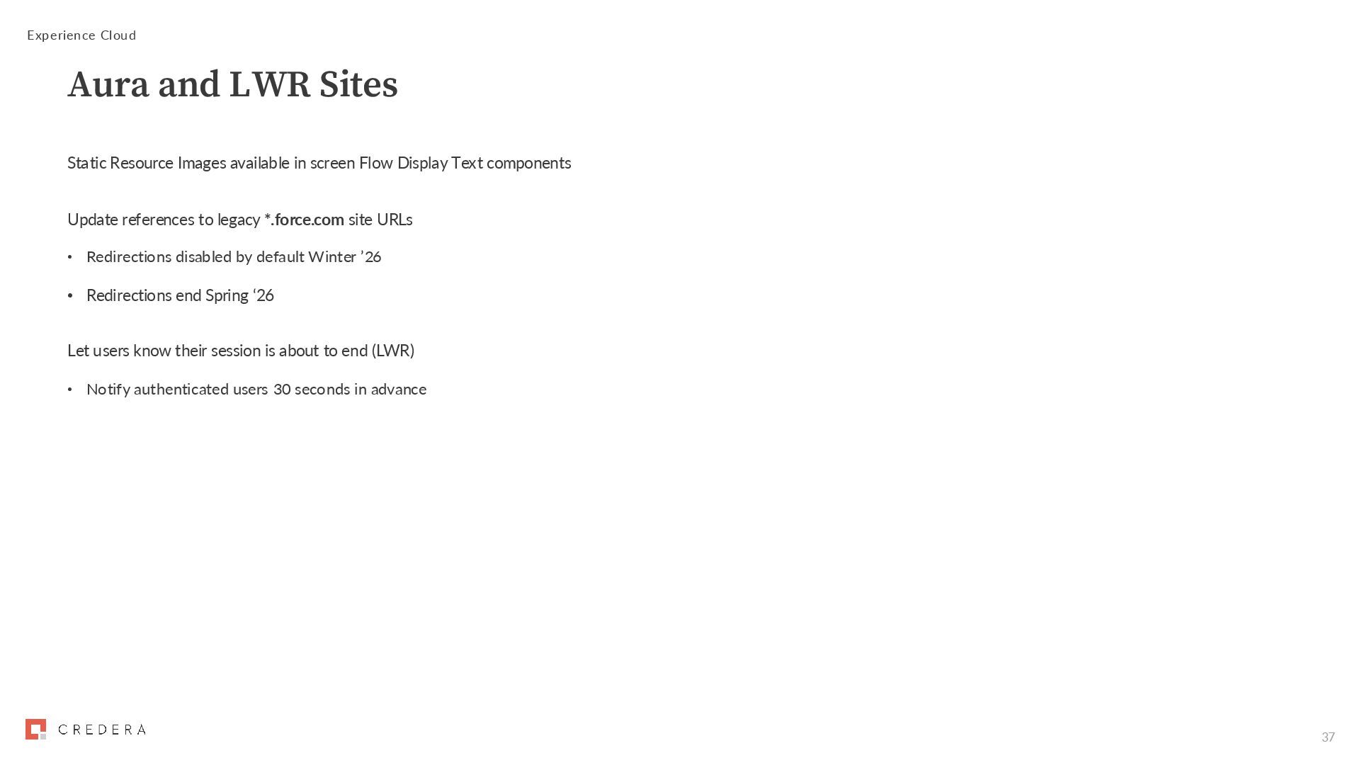 components Update references to legacy *.force.com site URLs • Redirections disabled by default Winter ’26 • Redirections end Spring ‘26 Let users know their session is about to end (LWR) • Notify authenticated users 30 seconds in advance Experience Cloud Aura and LWR Sites