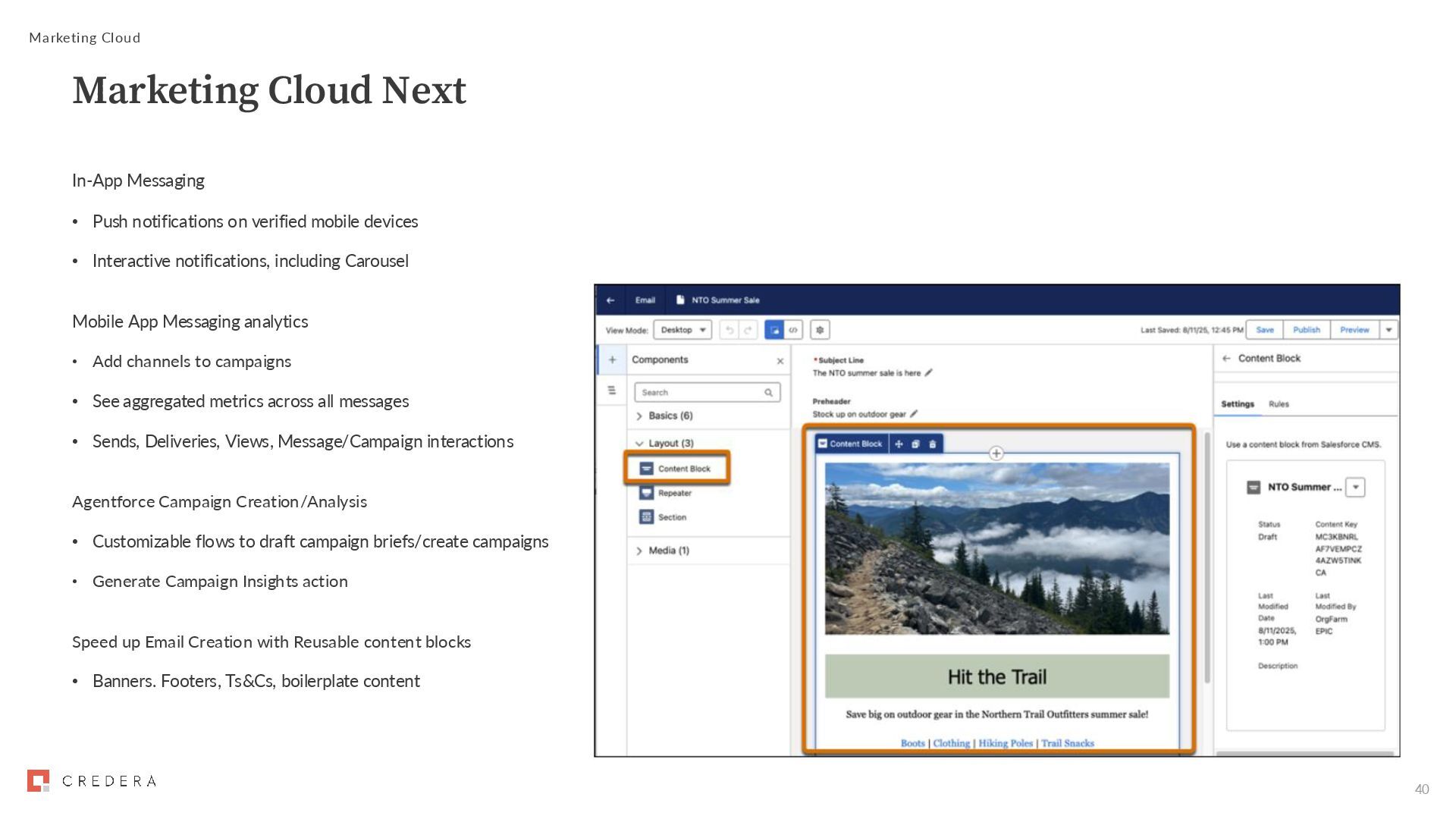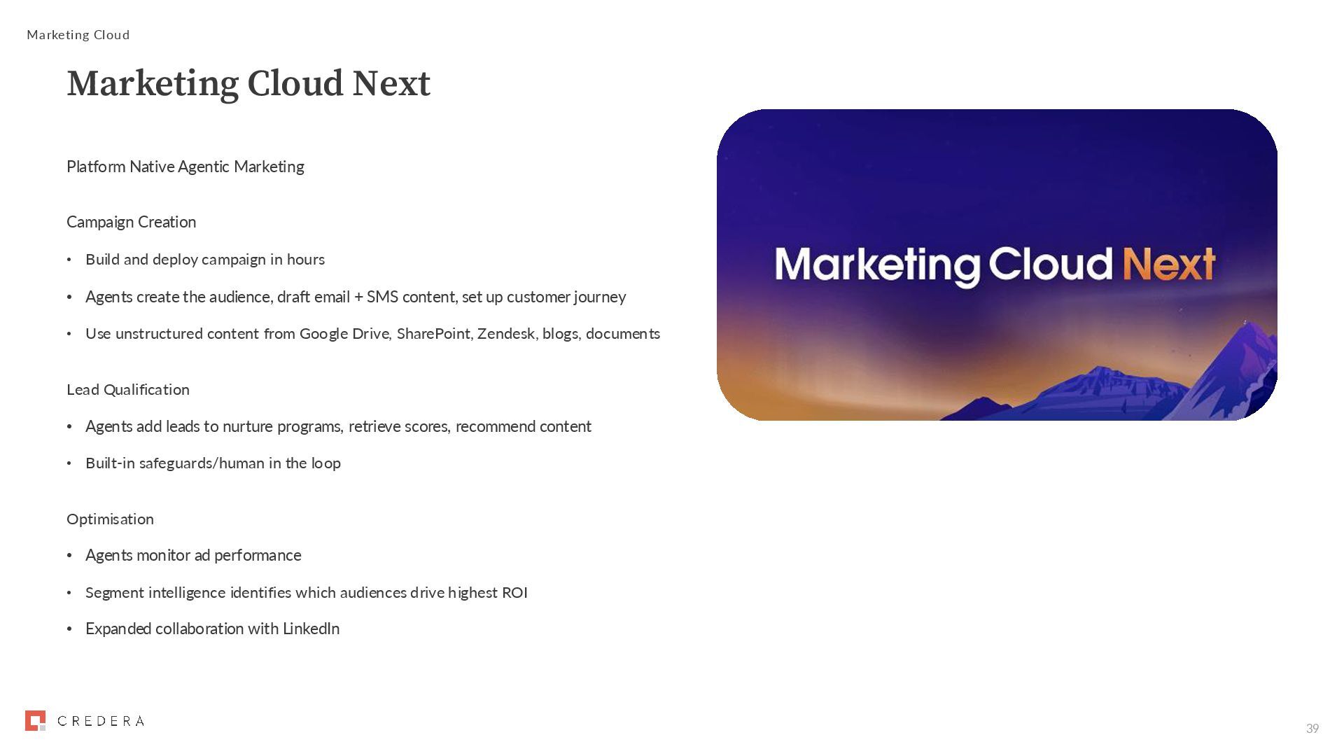 deploy campaign in hours • Agents create the audience, draft email + SMS content, set up customer journey • Use unstructured content from Google Drive, SharePoint, Zendesk, blogs, documents Lead Qualification • Agents add leads to nurture programs, retrieve scores, recommend content • Built-in safeguards/human in the loop Optimisation • Agents monitor ad performance • Segment intelligence identifies which audiences drive highest ROI • Expanded collaboration with LinkedIn Marketing Cloud Marketing Cloud Next