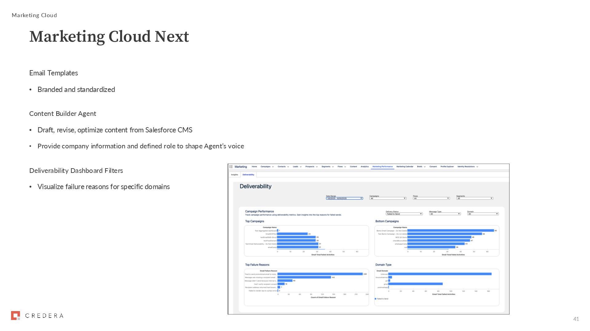 • Draft, revise, optimize content from Salesforce CMS • Provide company information and defined role to shape Agent’s voice Deliverability Dashboard Filters • Visualize failure reasons for specific domains Marketing Cloud Marketing Cloud Next