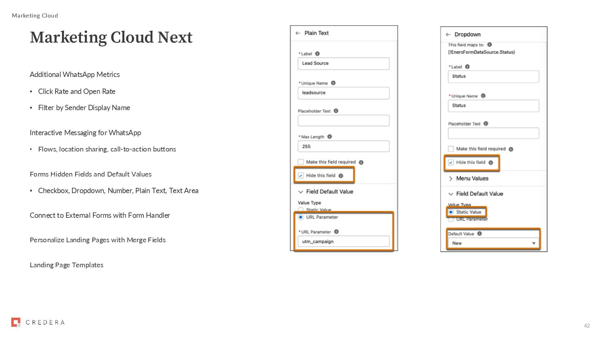 • Filter by Sender Display Name Interactive Messaging for WhatsApp • Flows, location sharing, call-to-action buttons Forms Hidden Fields and Default Values • Checkbox, Dropdown, Number, Plain Text, Text Area Connect to External Forms with Form Handler Personalize Landing Pages with Merge Fields Landing Page Templates Marketing Cloud Marketing Cloud Next