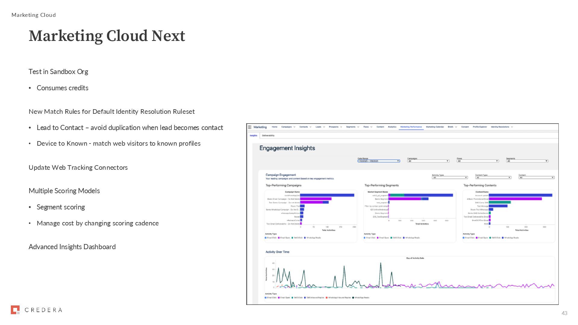 Rules for Default Identity Resolution Ruleset • Lead to Contact – avoid duplication when lead becomes contact • Device to Known - match web visitors to known profiles Update Web Tracking Connectors Multiple Scoring Models • Segment scoring • Manage cost by changing scoring cadence Advanced Insights Dashboard Marketing Cloud Marketing Cloud Next