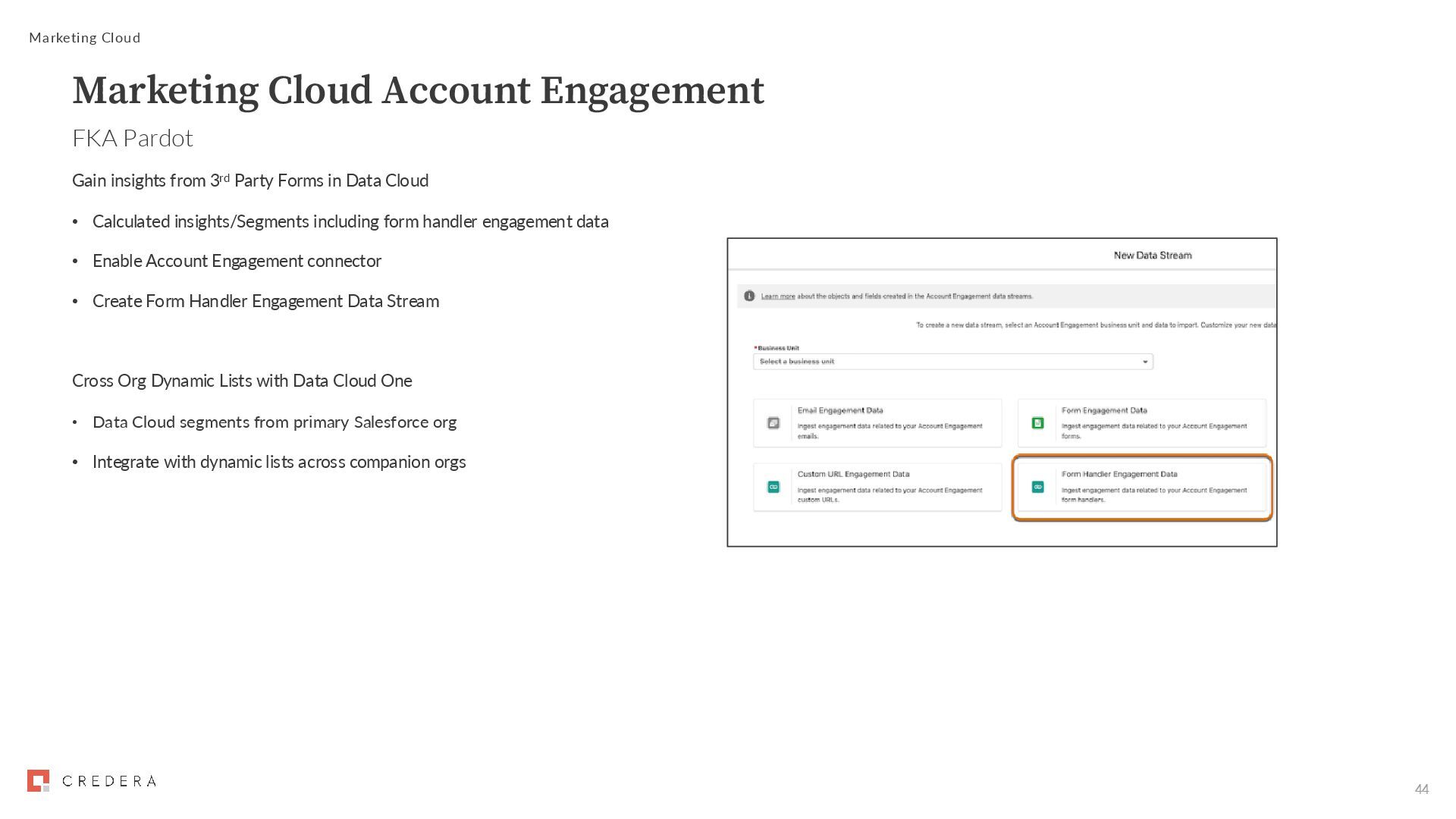 • Calculated insights/Segments including form handler engagement data • Enable Account Engagement connector • Create Form Handler Engagement Data Stream Cross Org Dynamic Lists with Data Cloud One • Data Cloud segments from primary Salesforce org • Integrate with dynamic lists across companion orgs Marketing Cloud Marketing Cloud Account Engagement FKA Pardot