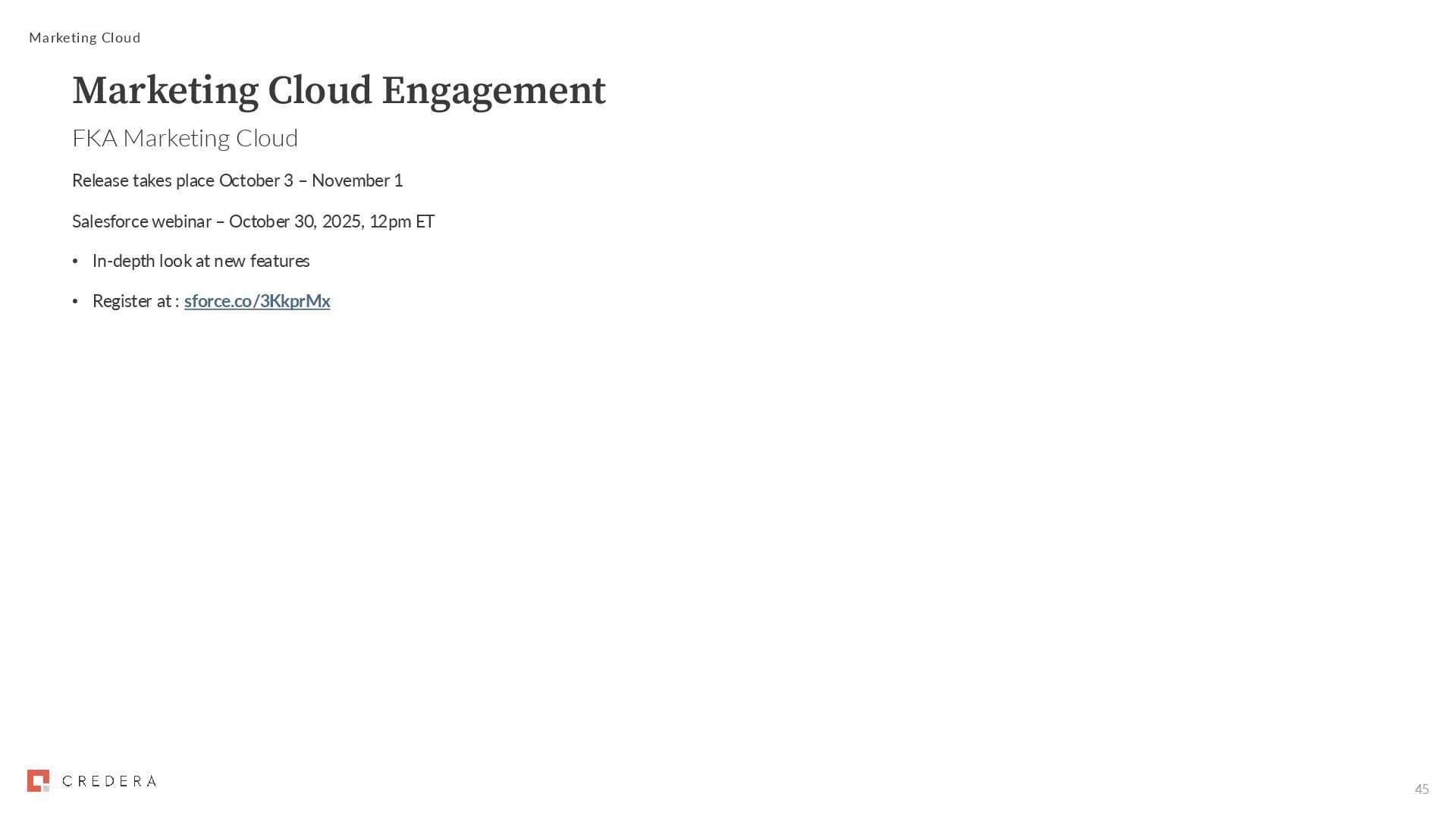 webinar – October 30, 2025, 12pm ET • In-depth look at new features • Register at : sforce.co/3KkprMx Marketing Cloud Marketing Cloud Engagement FKA Marketing Cloud