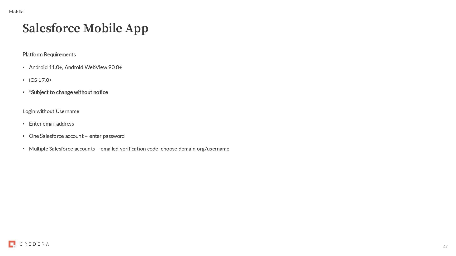 iOS 17.0+ • *Subject to change without notice Login without Username • Enter email address • One Salesforce account – enter password • Multiple Salesforce accounts – emailed verification code, choose domain org/username Mobile Salesforce Mobile App