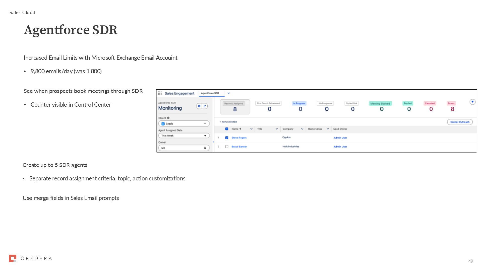 9,800 emails/day (was 1,800) See when prospects book meetings through SDR • Counter visible in Control Center Sales Cloud Agentforce SDR Create up to 5 SDR agents • Separate record assignment criteria, topic, action customizations Use merge fields in Sales Email prompts