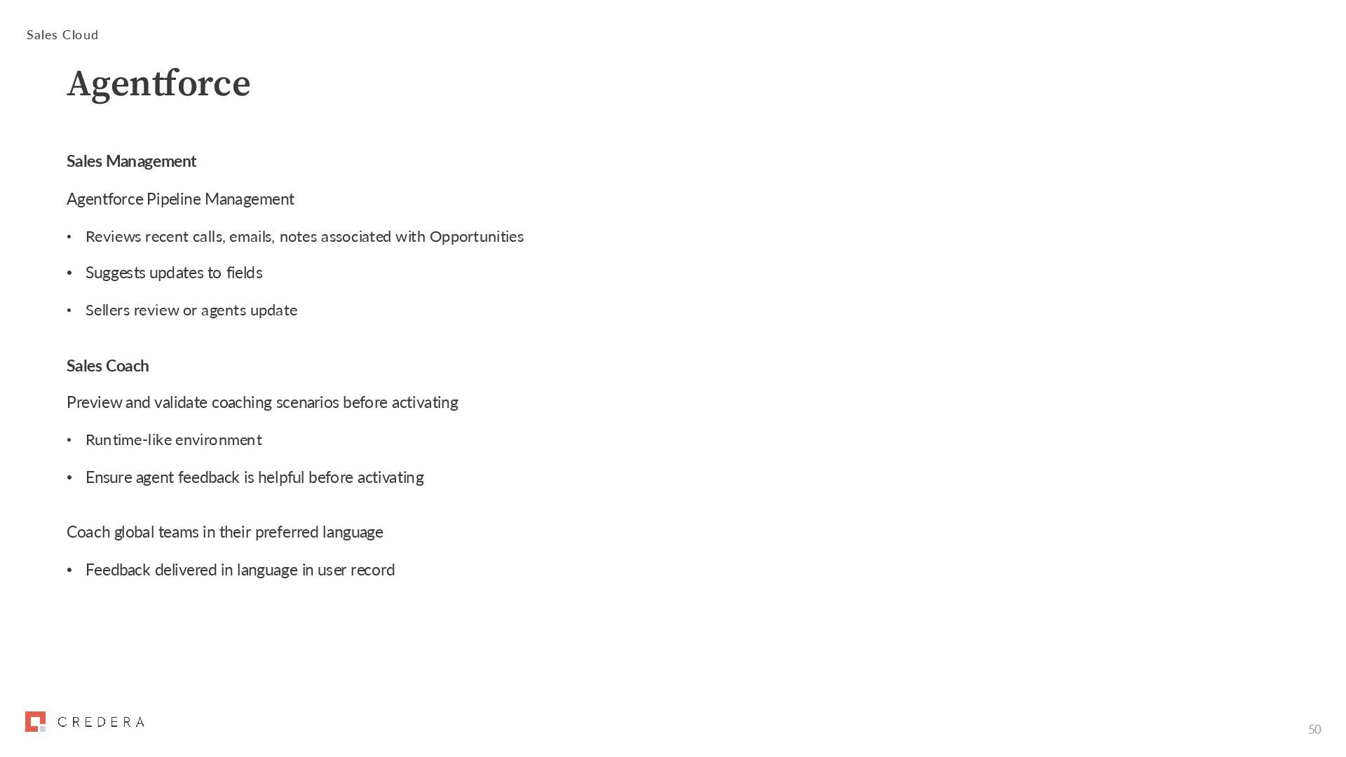 emails, notes associated with Opportunities • Suggests updates to fields • Sellers review or agents update Sales Coach Preview and validate coaching scenarios before activating • Runtime-like environment • Ensure agent feedback is helpful before activating Coach global teams in their preferred language • Feedback delivered in language in user record Sales Cloud Agentforce