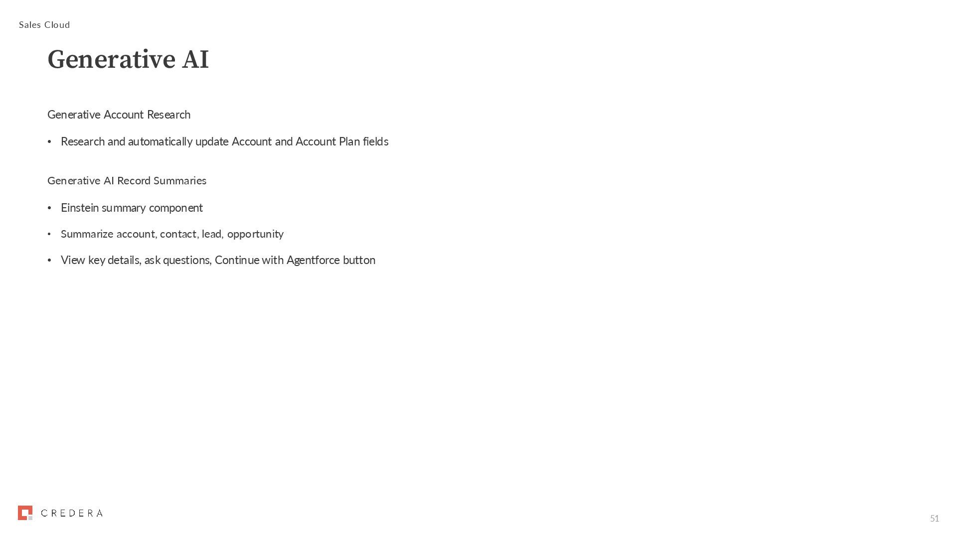 and Account Plan fields Generative AI Record Summaries • Einstein summary component • Summarize account, contact, lead, opportunity • View key details, ask questions, Continue with Agentforce button Sales Cloud Generative AI