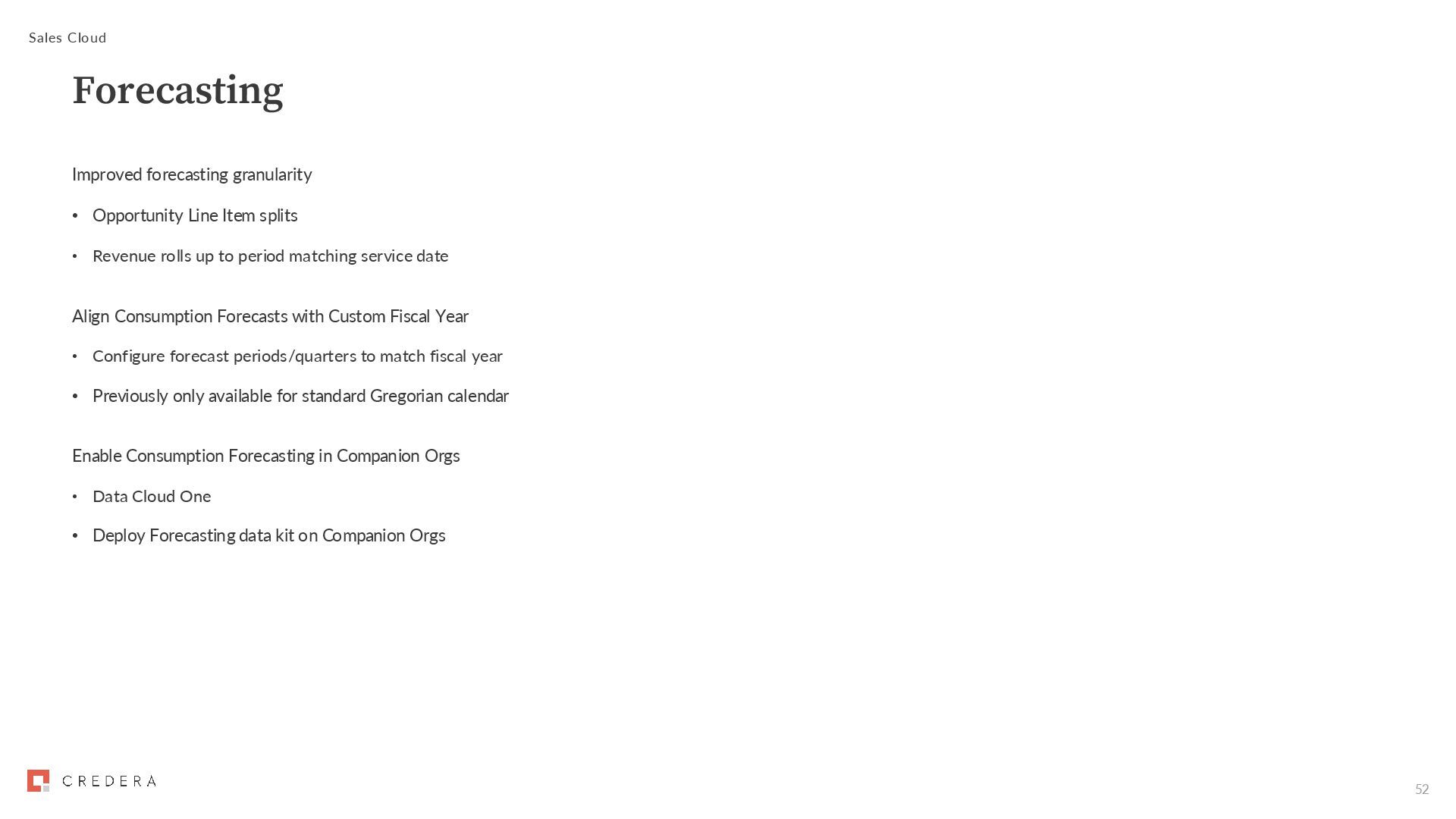 Revenue rolls up to period matching service date Align Consumption Forecasts with Custom Fiscal Year • Configure forecast periods/quarters to match fiscal year • Previously only available for standard Gregorian calendar Enable Consumption Forecasting in Companion Orgs • Data Cloud One • Deploy Forecasting data kit on Companion Orgs Sales Cloud Forecasting