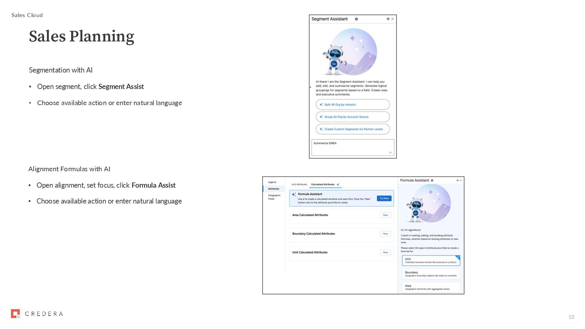 • Choose available action or enter natural language Sales Cloud Sales Planning Alignment Formulas with AI • Open alignment, set focus, click Formula Assist • Choose available action or enter natural language