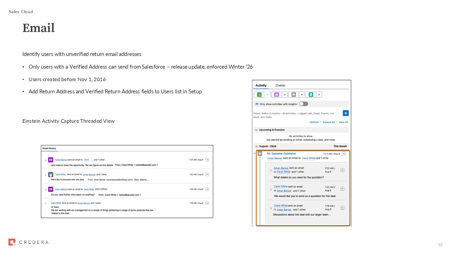 users with a Verified Address can send from Salesforce – release update, enforced Winter ‘26 • Users created before Nov 1, 2016 • Add Return Address and Verified Return Address fields to Users list in Setup Sales Cloud Email Einstein Activity Capture Threaded View