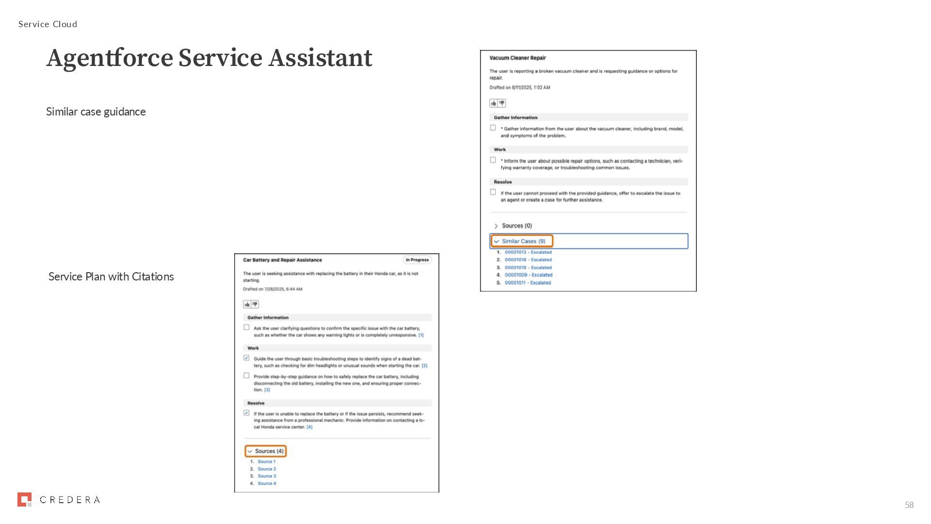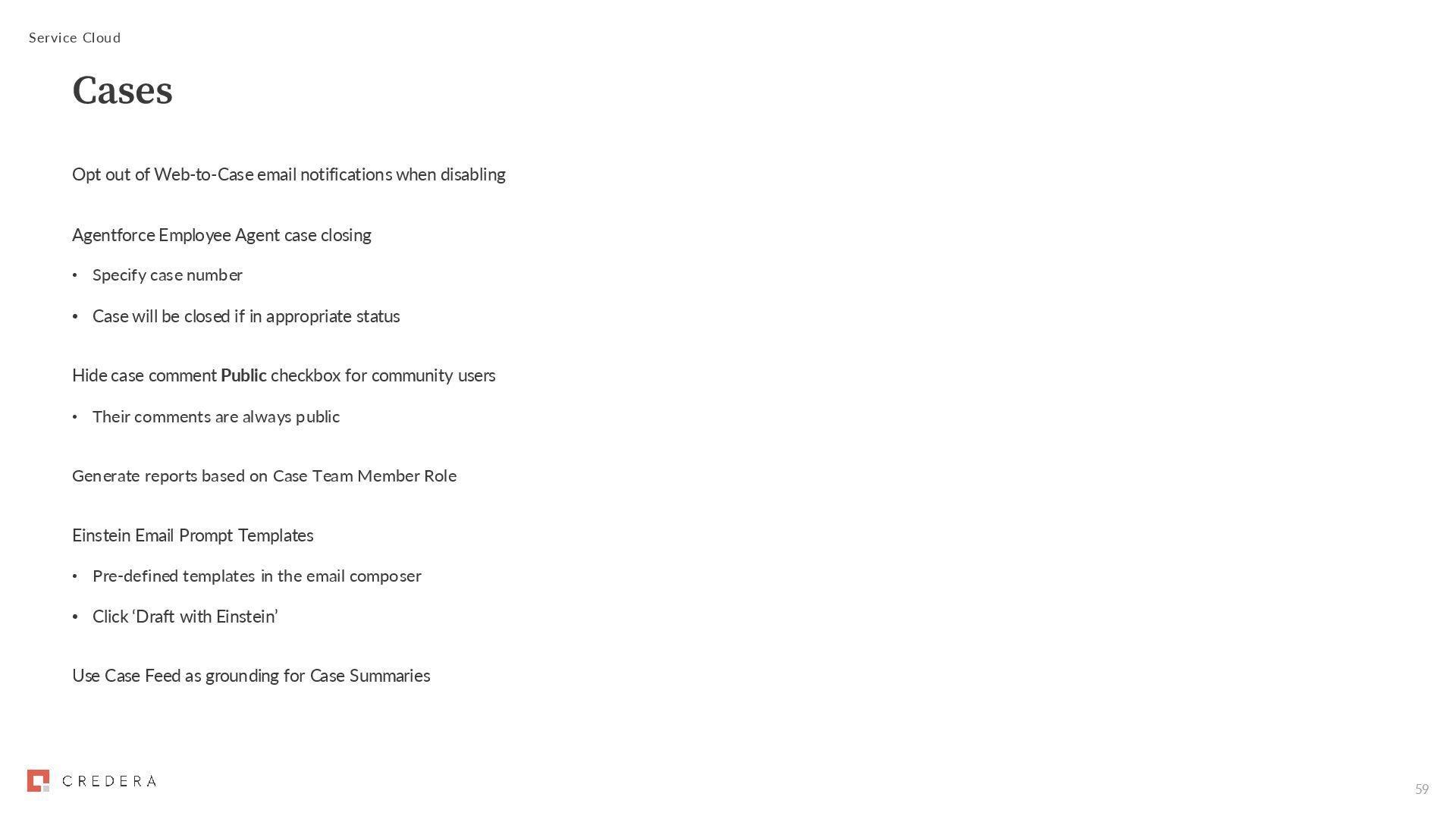 Employee Agent case closing • Specify case number • Case will be closed if in appropriate status Hide case comment Public checkbox for community users • Their comments are always public Generate reports based on Case Team Member Role Einstein Email Prompt Templates • Pre-defined templates in the email composer • Click ‘Draft with Einstein’ Use Case Feed as grounding for Case Summaries Service Cloud Cases