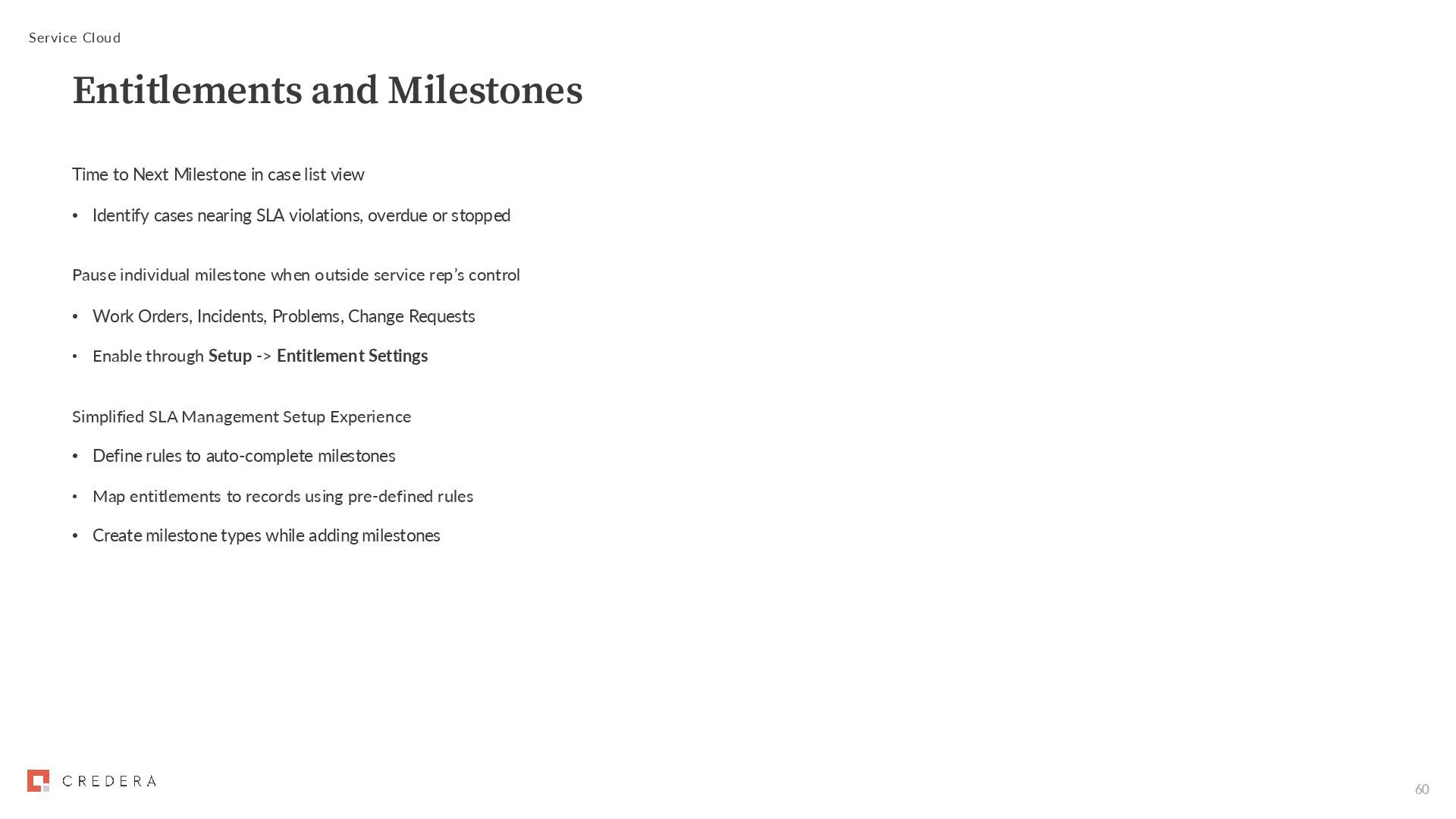 Identify cases nearing SLA violations, overdue or stopped Pause individual milestone when outside service rep’s control • Work Orders, Incidents, Problems, Change Requests • Enable through Setup -> Entitlement Settings Simplified SLA Management Setup Experience • Define rules to auto-complete milestones • Map entitlements to records using pre-defined rules • Create milestone types while adding milestones Service Cloud Entitlements and Milestones