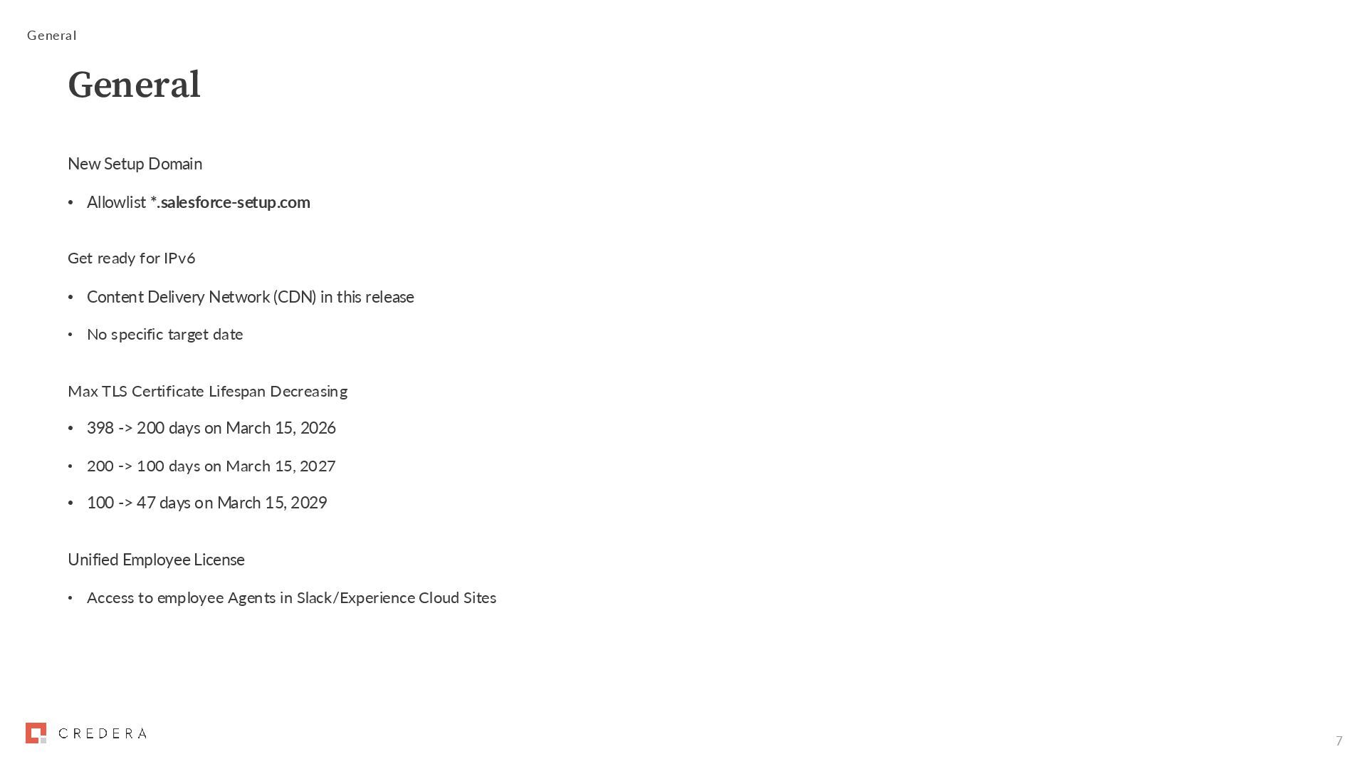 IPv6 • Content Delivery Network (CDN) in this release • No specific target date Max TLS Certificate Lifespan Decreasing • 398 -> 200 days on March 15, 2026 • 200 -> 100 days on March 15, 2027 • 100 -> 47 days on March 15, 2029 Unified Employee License • Access to employee Agents in Slack/Experience Cloud Sites General General