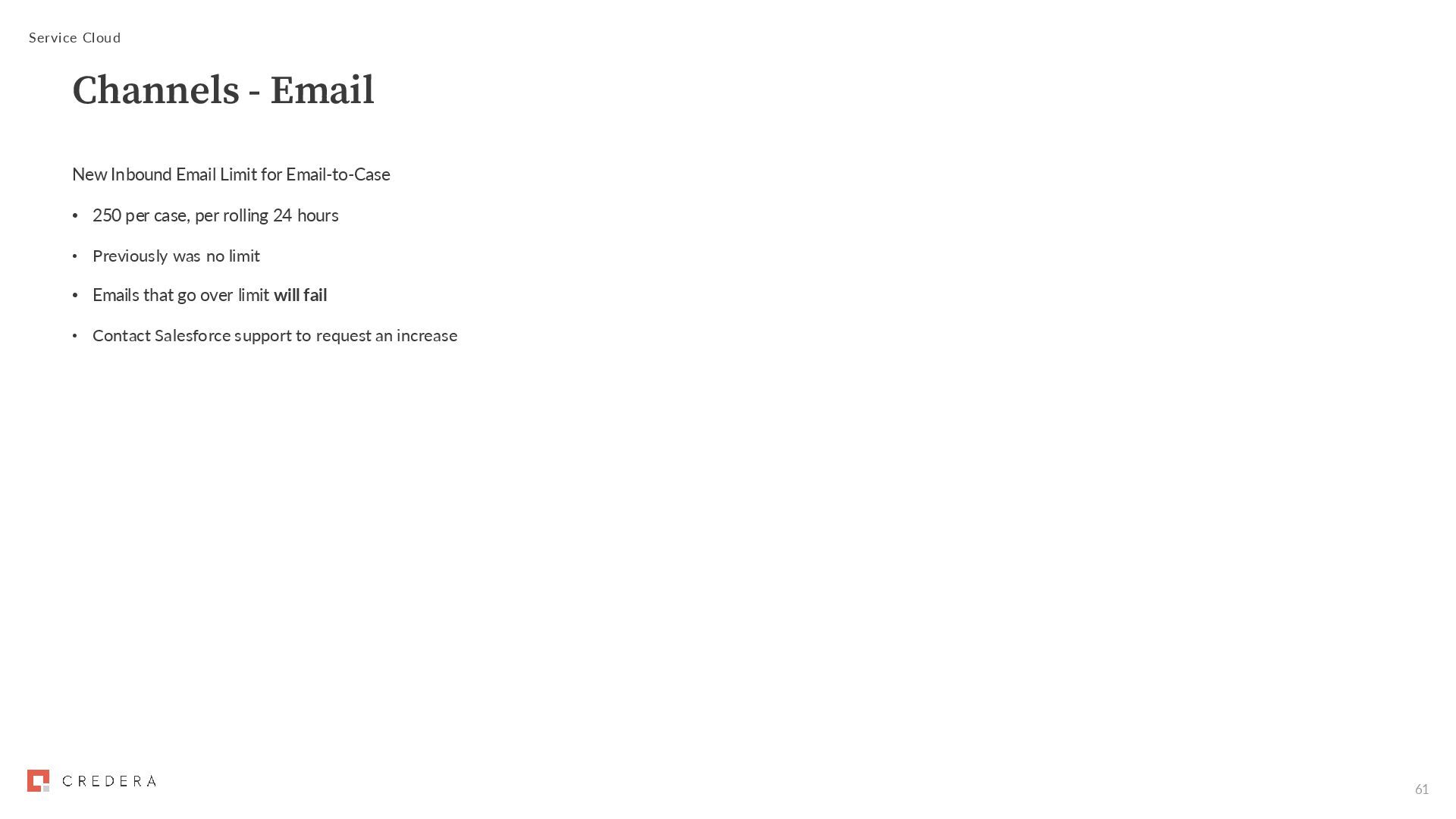 case, per rolling 24 hours • Previously was no limit • Emails that go over limit will fail • Contact Salesforce support to request an increase Service Cloud Channels - Email