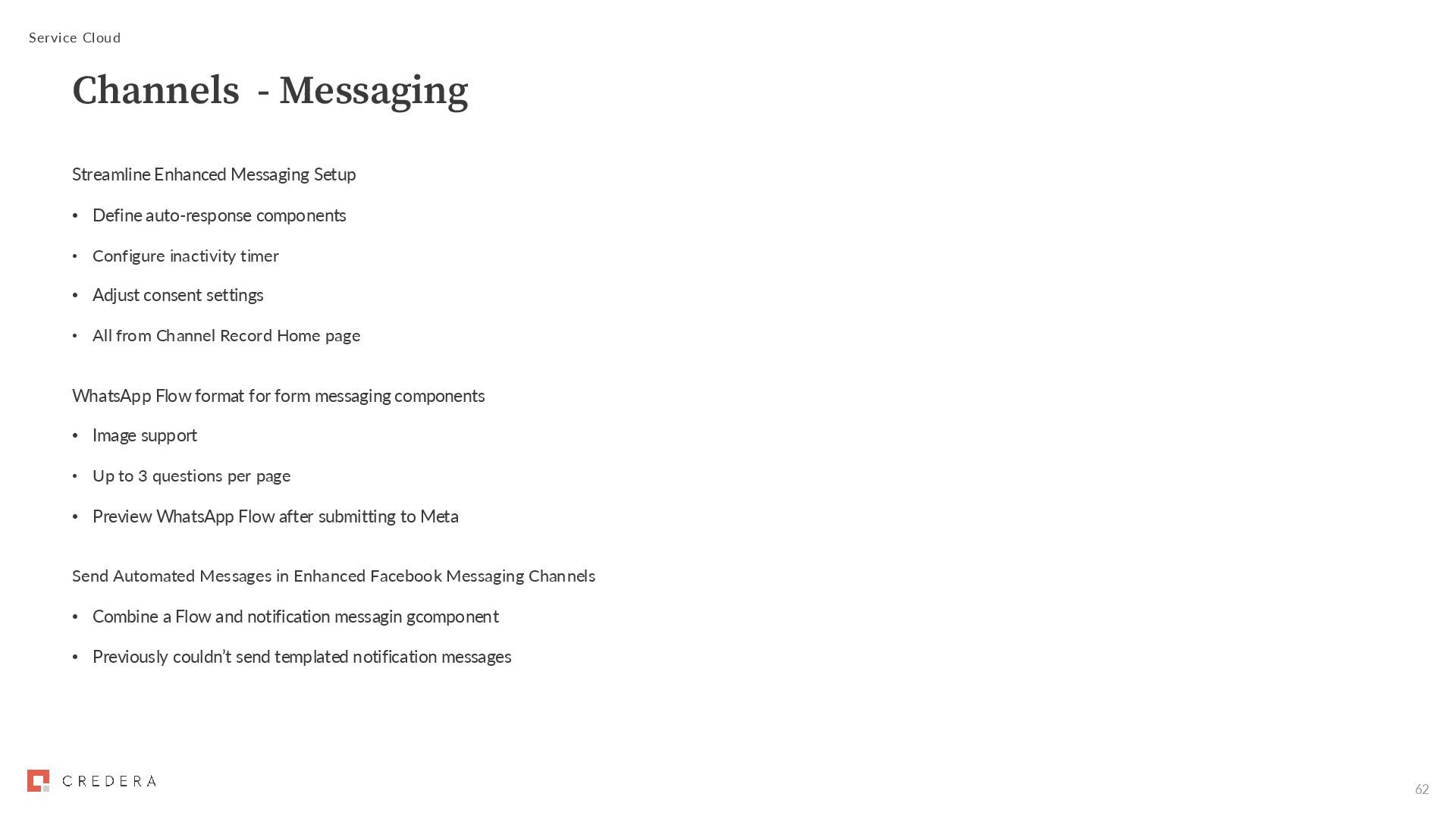 Configure inactivity timer • Adjust consent settings • All from Channel Record Home page WhatsApp Flow format for form messaging components • Image support • Up to 3 questions per page • Preview WhatsApp Flow after submitting to Meta Send Automated Messages in Enhanced Facebook Messaging Channels • Combine a Flow and notification messagin gcomponent • Previously couldn’t send templated notification messages Service Cloud Channels - Messaging