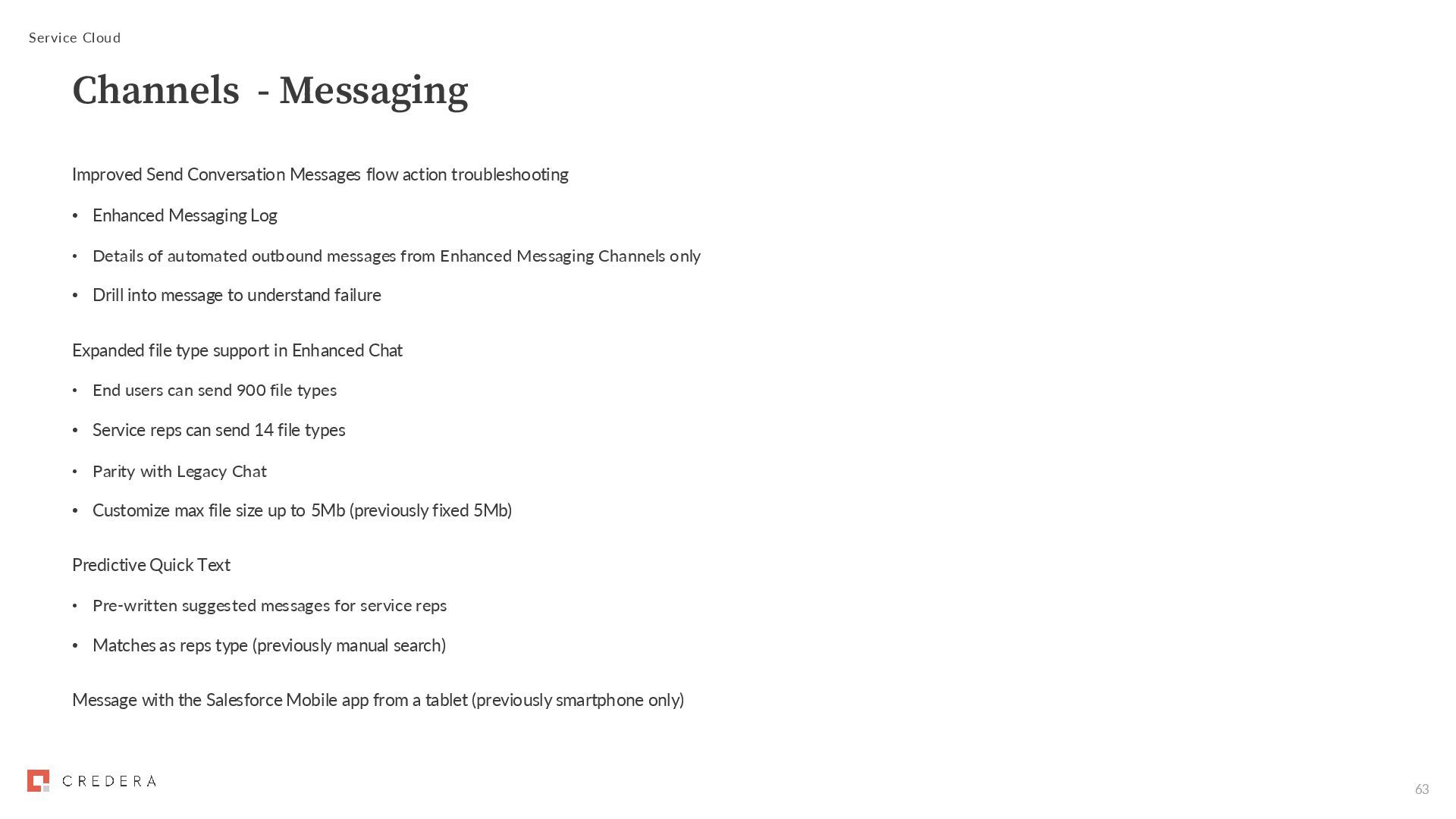 Messaging Log • Details of automated outbound messages from Enhanced Messaging Channels only • Drill into message to understand failure Expanded file type support in Enhanced Chat • End users can send 900 file types • Service reps can send 14 file types • Parity with Legacy Chat • Customize max file size up to 5Mb (previously fixed 5Mb) Predictive Quick Text • Pre-written suggested messages for service reps • Matches as reps type (previously manual search) Message with the Salesforce Mobile app from a tablet (previously smartphone only) Service Cloud Channels - Messaging
