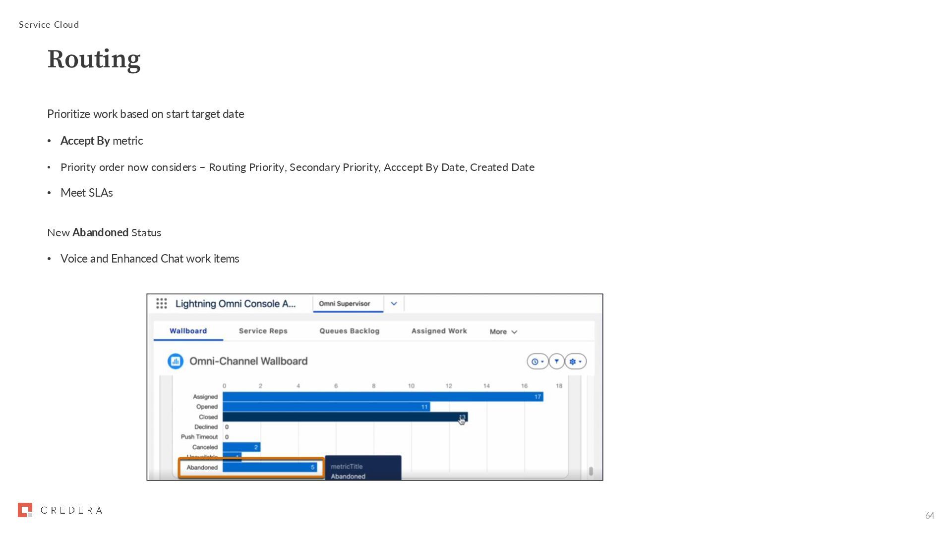 By metric • Priority order now considers – Routing Priority, Secondary Priority, Acccept By Date, Created Date • Meet SLAs New Abandoned Status • Voice and Enhanced Chat work items Service Cloud Routing