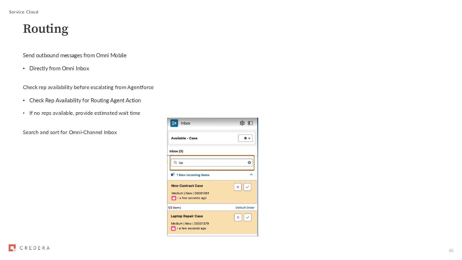 Omni Inbox Check rep availability before escalating from Agentforce • Check Rep Availability for Routing Agent Action • If no reps available, provide estimated wait time Search and sort for Omni-Channel Inbox Service Cloud Routing
