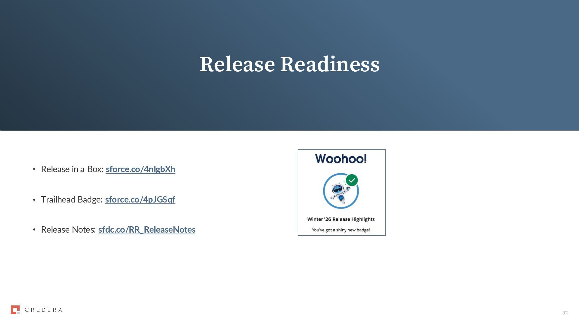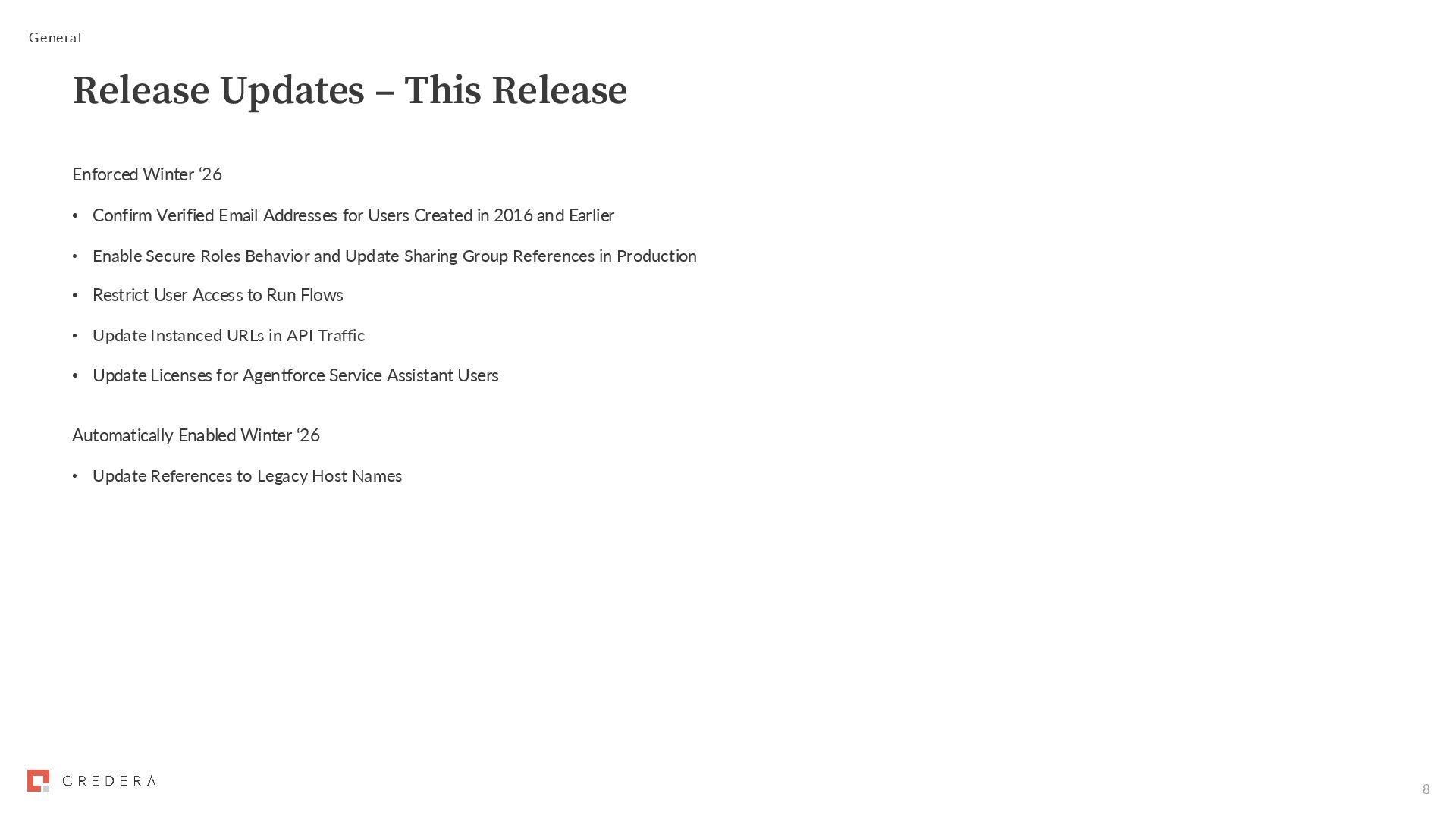 Users Created in 2016 and Earlier • Enable Secure Roles Behavior and Update Sharing Group References in Production • Restrict User Access to Run Flows • Update Instanced URLs in API Traffic • Update Licenses for Agentforce Service Assistant Users Automatically Enabled Winter ‘26 • Update References to Legacy Host Names General Release Updates – This Release