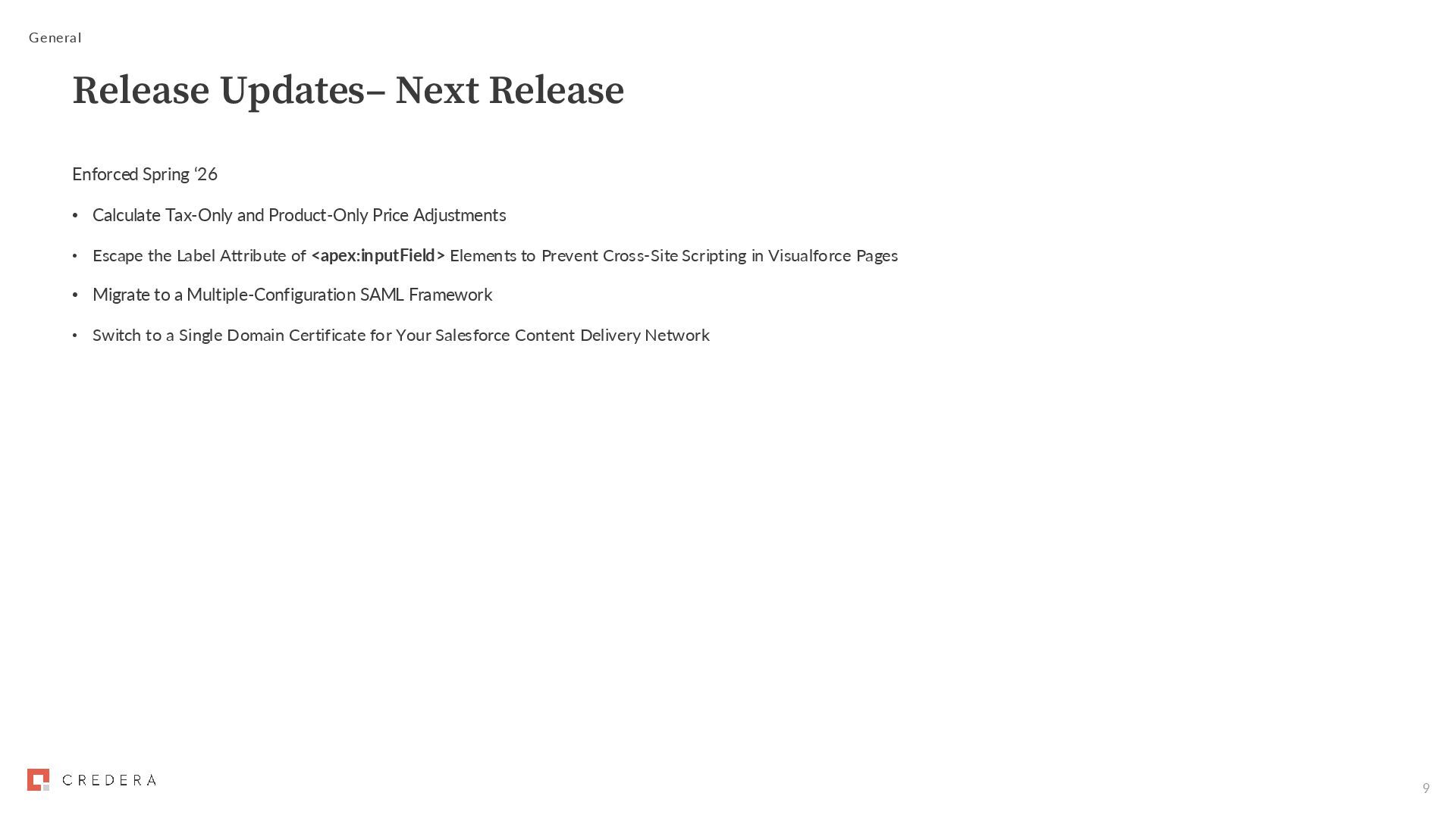 Adjustments • Escape the Label Attribute of <apex:inputField> Elements to Prevent Cross-Site Scripting in Visualforce Pages • Migrate to a Multiple-Configuration SAML Framework • Switch to a Single Domain Certificate for Your Salesforce Content Delivery Network General Release Updates– Next Release