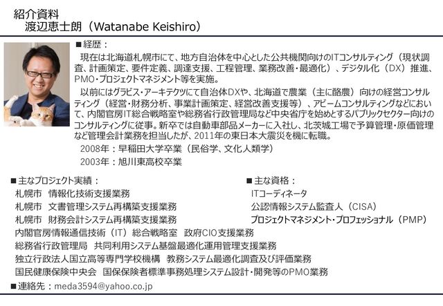 紹介資料 渡辺恵士朗(Watanabe Keishiro) ▪経歴: 現在は北海道札幌市にて、地方自治体を中心とした公共機関向けのITコンサルティング(現状調 査、計画策定、要件定義、調達支援、工程管理、業務改善・最適化)、デジタル化(DX)推進、 PMO・プロジェクトマネジメント等を実施。 以前にはグラビス・アーキテクツにて自治体DXや、北海道で農業(主に酪農)向けの経営コンサル ティング(経営・財務分析、事業計画策定、経営改善支援等)、アビームコンサルティングなどにおい て、内閣官房IT総合戦略室や総務省行政管理局など中央省庁を始めとするパブリックセクター向けの