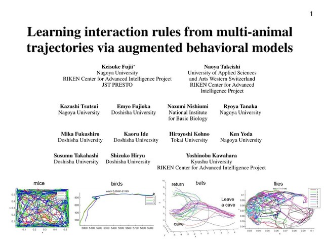via ABM, which can extract interaction rules from real-world multi-agent and multi-dimensional trajectory data • We realized the theory-guided regularization for reliable biological behavioral modeling, which can leverage scientific knowledge such that “when this situation occurs, it would be like this” • Biologically, we reformulate a well-known conceptual behavioral model, which did not have a numerically computable form, such that we can compute and quantitatively evaluate it • Our method achieved better performance than various baselines using synthetic datasets, and obtained new biological insights using multiple datasets of mice, birds, bats, and flies 13 Acknowledgments: This work was supported by JSPS KAKENHI (Grant Numbers 19H04941, 20H04075, 16H06541, 25281056, 21H05296, 18H03786, 21H05295, 19H04939, JP18H03287, and 21H05300), JST PRESTO (JPMJPR20CA), and JST CREST (JPMJCR1913). For obtaining flies data, we would like to thank Ryota Nishimura at Nagoya Univ.