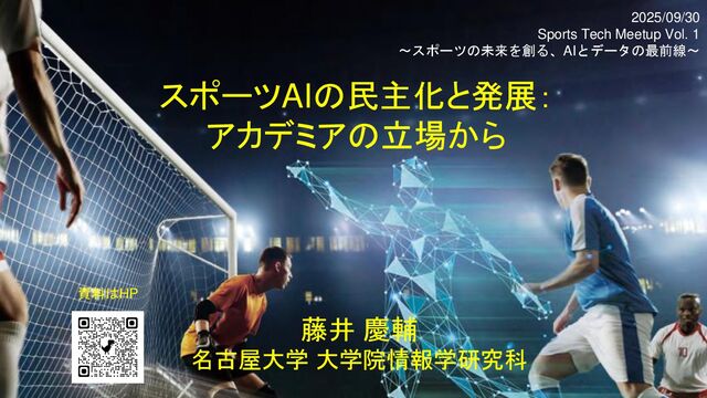 スポーツAIの民主化と発展: アカデミアの立場から 藤井 慶輔 名古屋大学 大学院情報学研究科 2025/09/30 Sports Tech Meetup