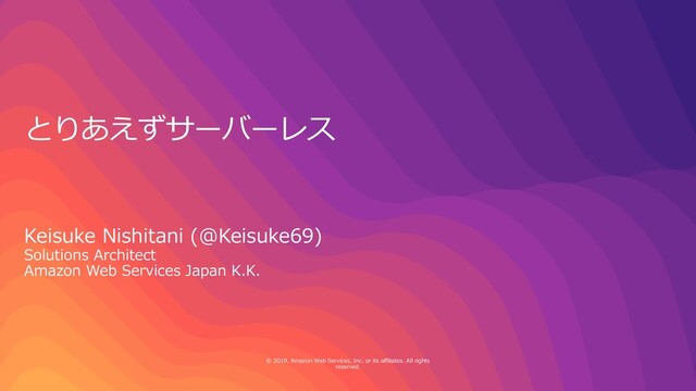 rights reserved. Keisuke Nishitani (@Keisuke69) Manager, Senior Solutions Architect Amazon Web Service Japan K.K Everything will be serverless. ⾳楽 x キャンプ x マンガ フジロッカー ブログ: https://www.keisuke69.net/