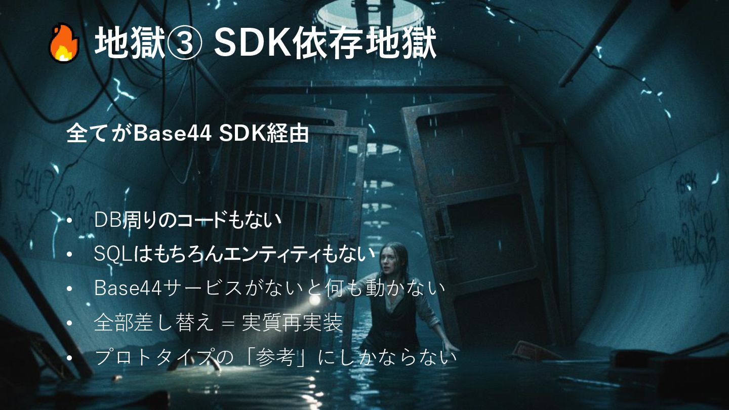 地獄③ SDK依存地獄 全てがBase44 SDK経由 • DB周りのコードもない • SQLはもちろんエンティティもない • Base44サービスがないと何も動かない