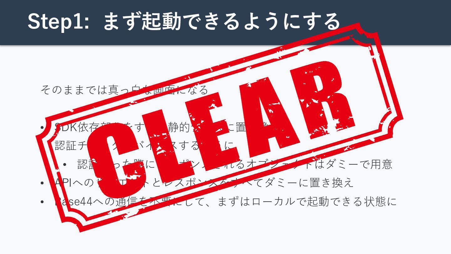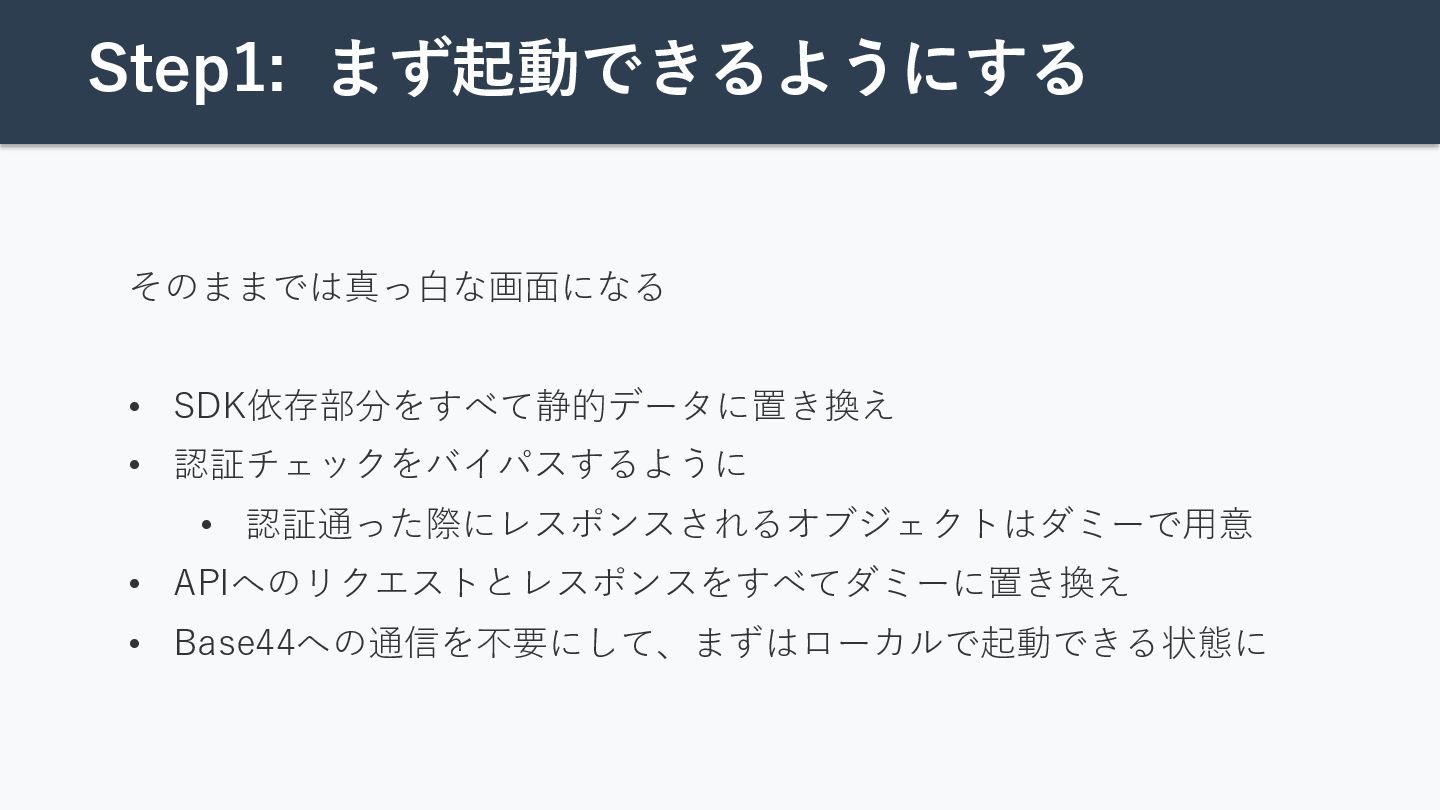 Step1: まず起動できるようにする そのままでは真っ白な画面になる • SDK依存部分をすべて静的データに置き換え • 認証チェックをバイパスするように • 認証通った際にレスポンスされるオブジェクトはダミーで用意 •