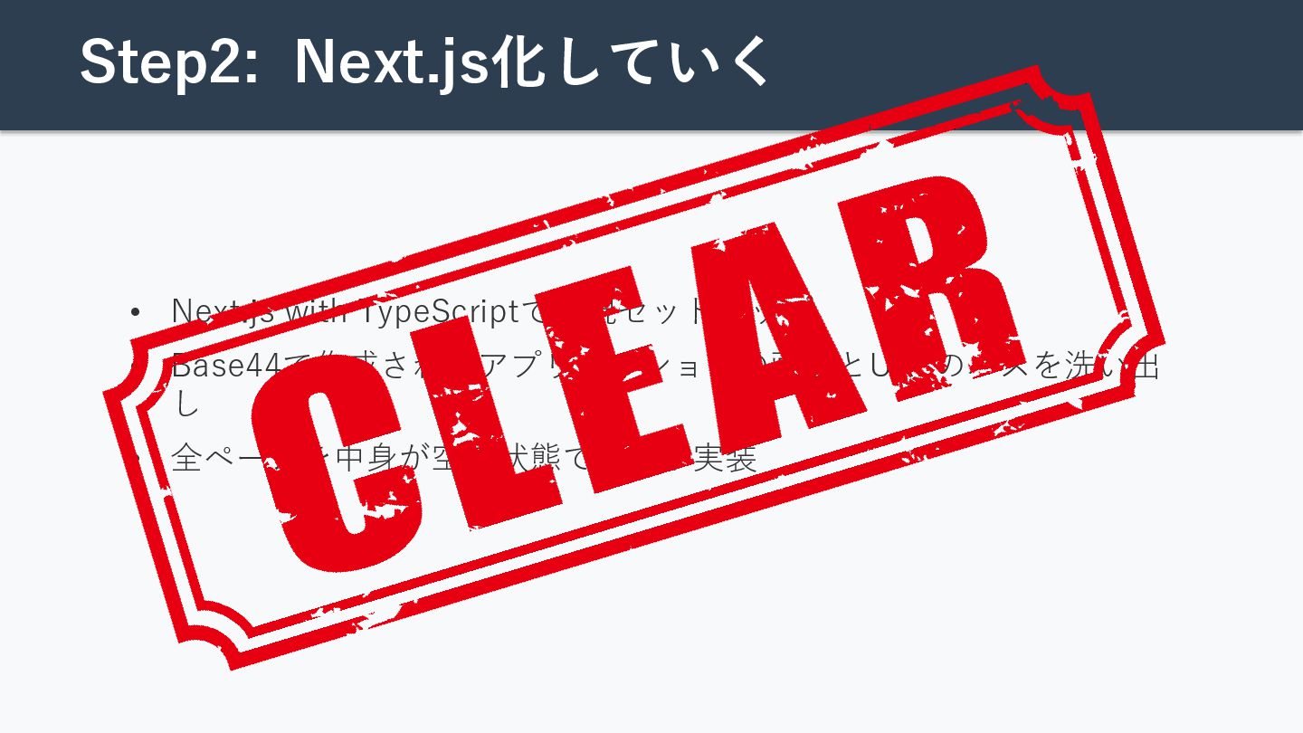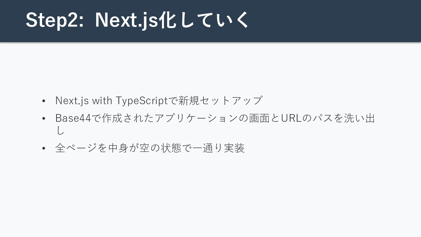 Step2: Next.js化していく • Next.js with TypeScriptで新規セットアップ • Base44で作成されたアプリケーションの画面とURLのパスを洗い出 し •