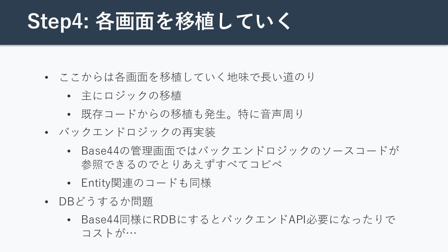 Step4: 各画面を移植していく • ここからは各画面を移植していく地味で長い道のり • 主にロジックの移植 • 既存コードからの移植も発生。特に音声周り • バックエンドロジックの再実装