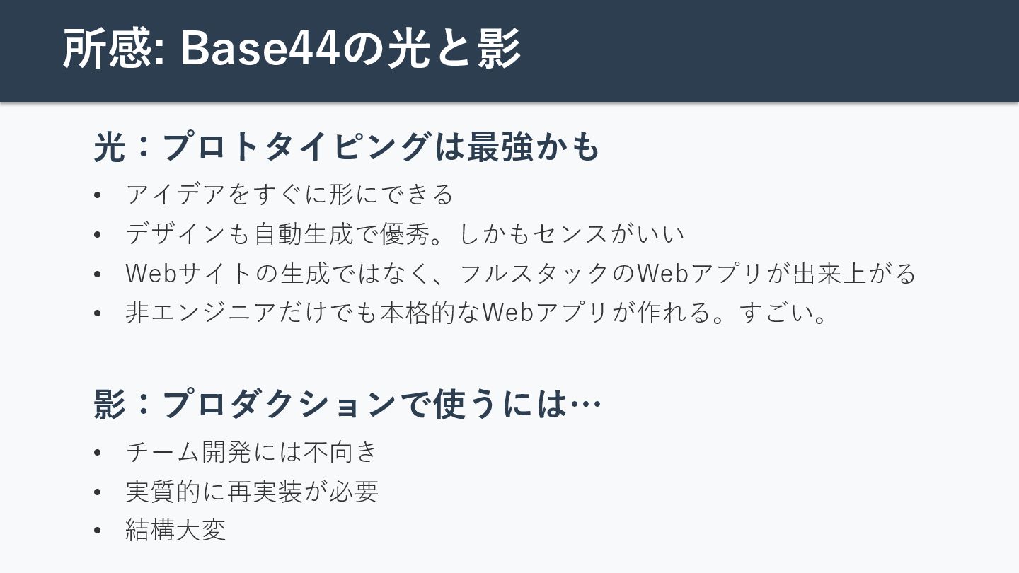 所感: Base44の光と影 光:プロトタイピングは最強かも • アイデアをすぐに形にできる • デザインも自動生成で優秀。しかもセンスがいい • Webサイトの生成ではなく、フルスタックのWebアプリが出来上がる •