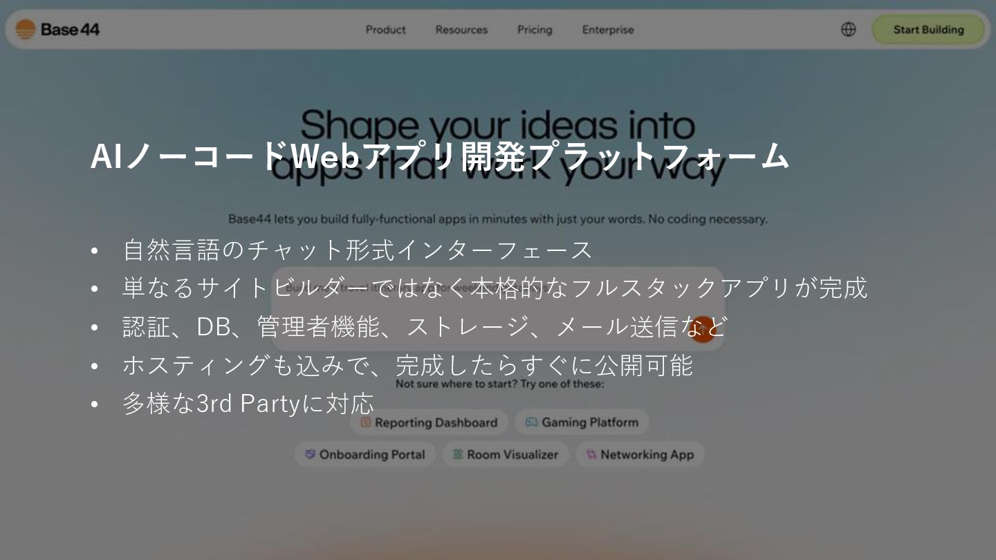 AIノーコードWebアプリ開発プラットフォーム • 自然言語のチャット形式インターフェース • 単なるサイトビルダーではなく本格的なフルスタックアプリが完成 • 認証、DB、管理者機能、ストレージ、メール送信など • ホスティングも込みで、完成したらすぐに公開可能 •