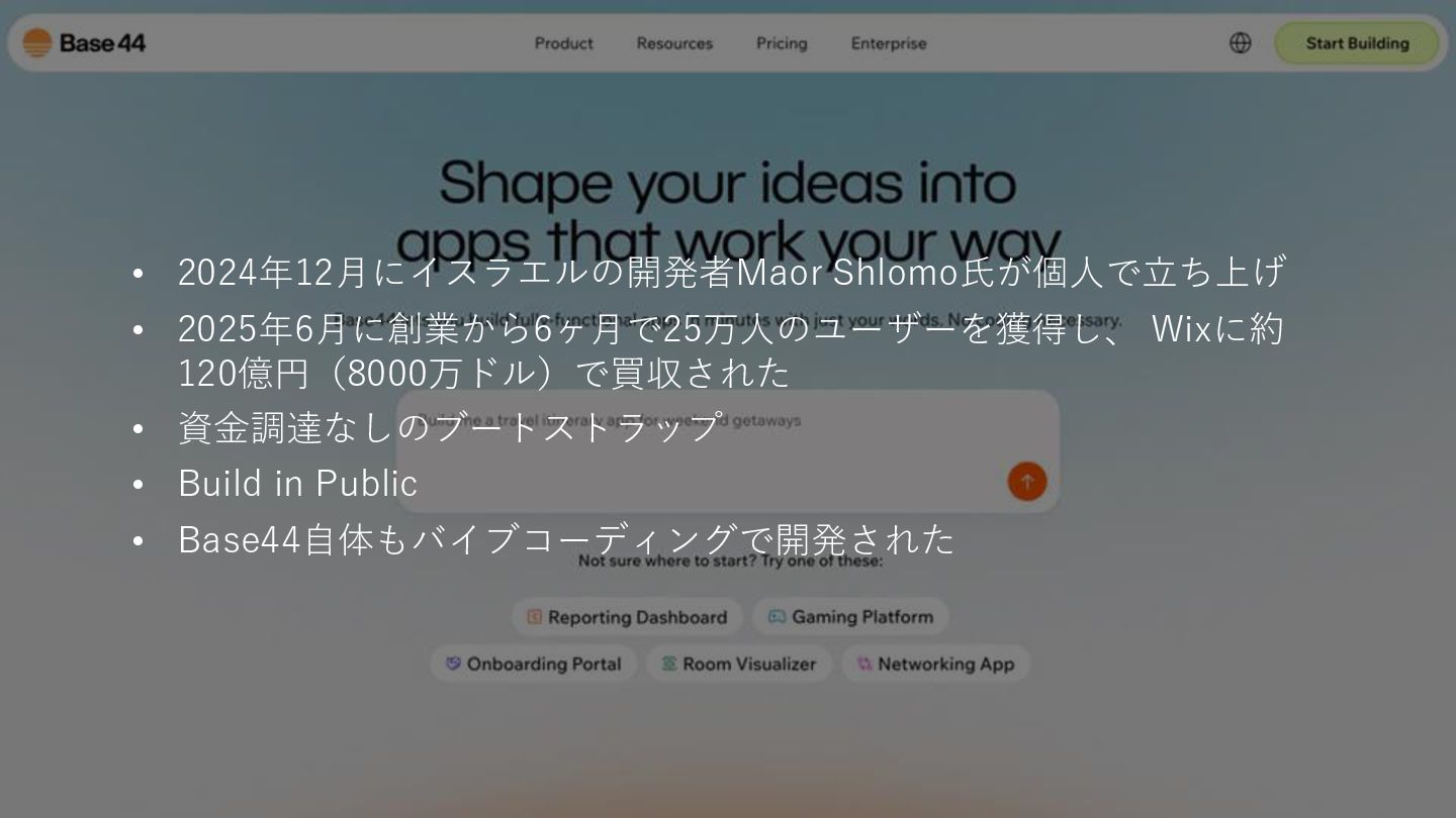 • 2024年12月にイスラエルの開発者Maor Shlomo氏が個人で立ち上げ • 2025年6月に創業から6ヶ月で25万人のユーザーを獲得し、 Wixに約 120億円(8000万ドル)で買収された • 資金調達なしのブートストラップ •