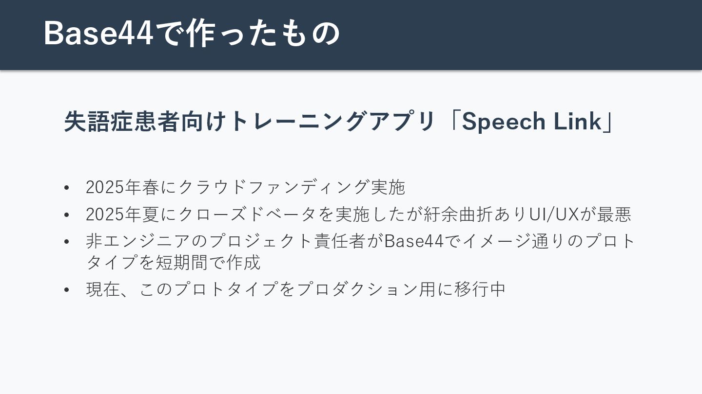Base44で作ったもの 失語症患者向けトレーニングアプリ「Speech Link」 • 2025年春にクラウドファンディング実施 • 2025年夏にクローズドベータを実施したが紆余曲折ありUI/UXが最悪 • 非エンジニアのプロジェクト責任者がBase44でイメージ通りのプロト タイプを短期間で作成