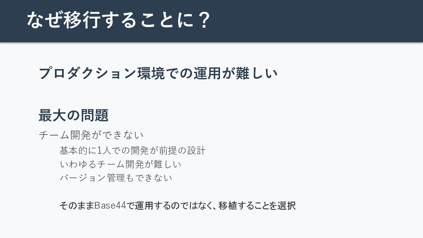 なぜ移行することに? プロダクション環境での運用が難しい 最大の問題 チーム開発ができない 基本的に1人での開発が前提の設計 いわゆるチーム開発が難しい バージョン管理もできない そのままBase44で運用するのではなく、移植することを選択