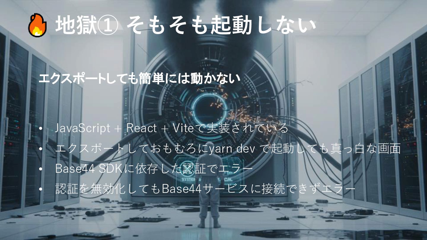 エクスポートしておもむろにyarn dev で起動しても真っ白な画面 • Base44 SDKに依存した認証でエラー • 認証を無効化してもBase44サービスに接続できずエラー